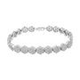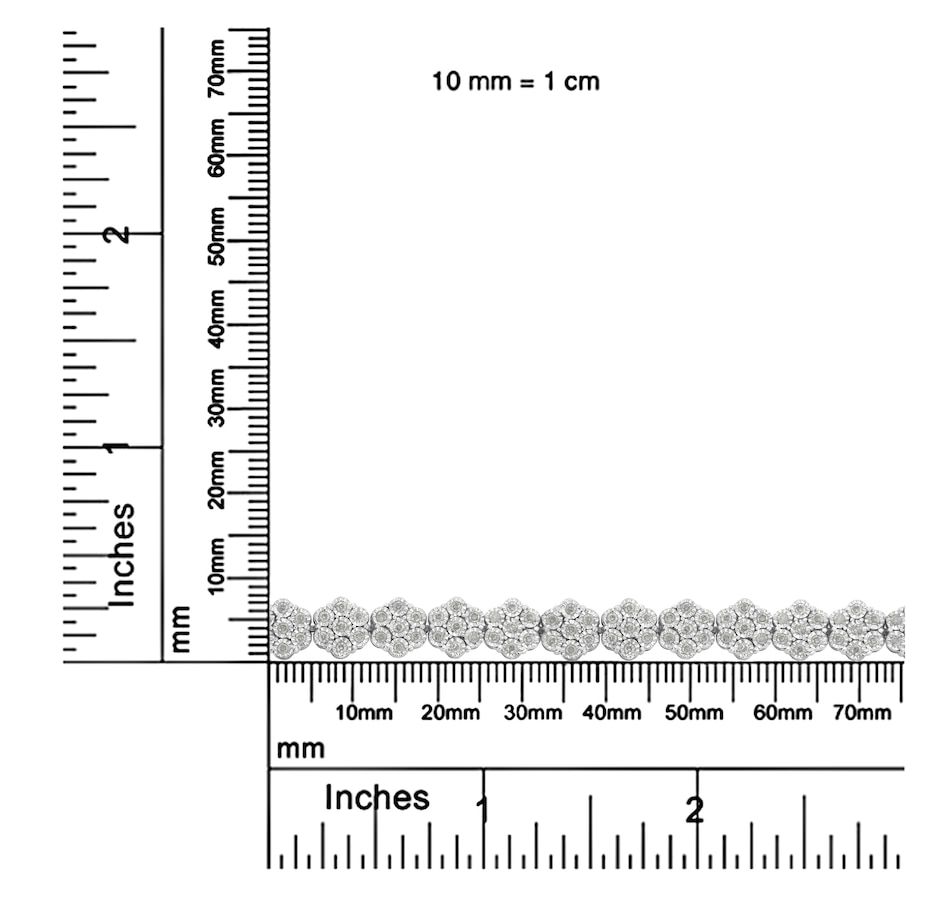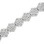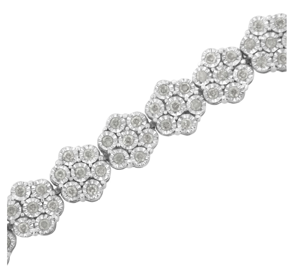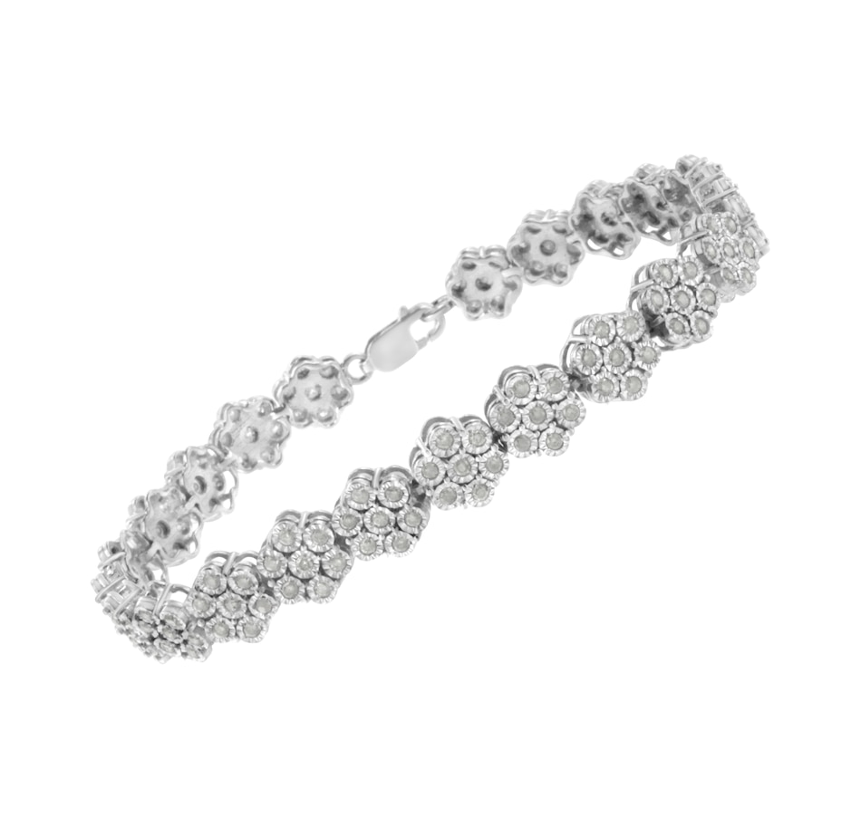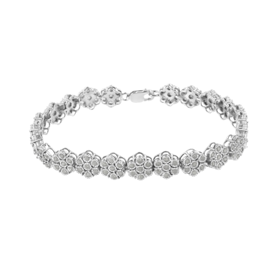 This wonderful flower link bracelet is fashioned in sterling silver and showcases 2 carats TDW in diamonds. One hundred and sixty one promo quality round cut diamonds glisten in this design. Seven miracle set diamonds create each one of the flower links that make up this unique bracelet that secures with a lobster claw clasp. Promo quality diamonds are on the lowest of diamond color and quality scale. Round-cut, promo quality diamonds are milky and cloudy in nature. They have asymmetrical ball shape and are filled with inclusions.