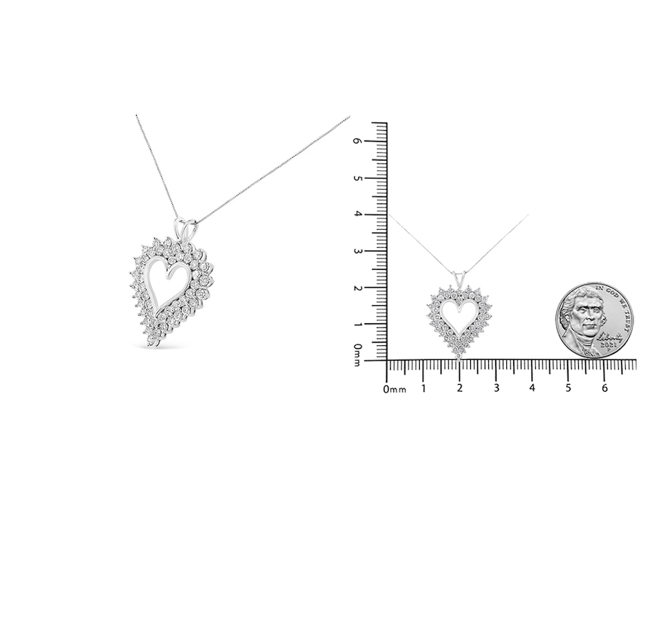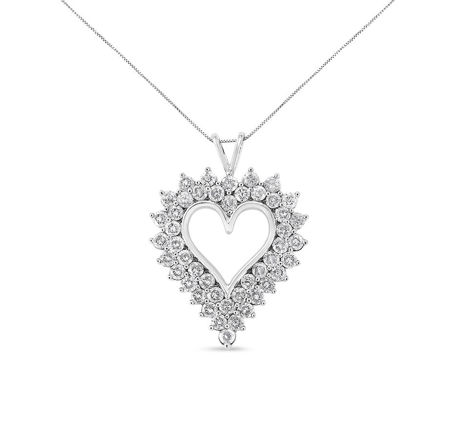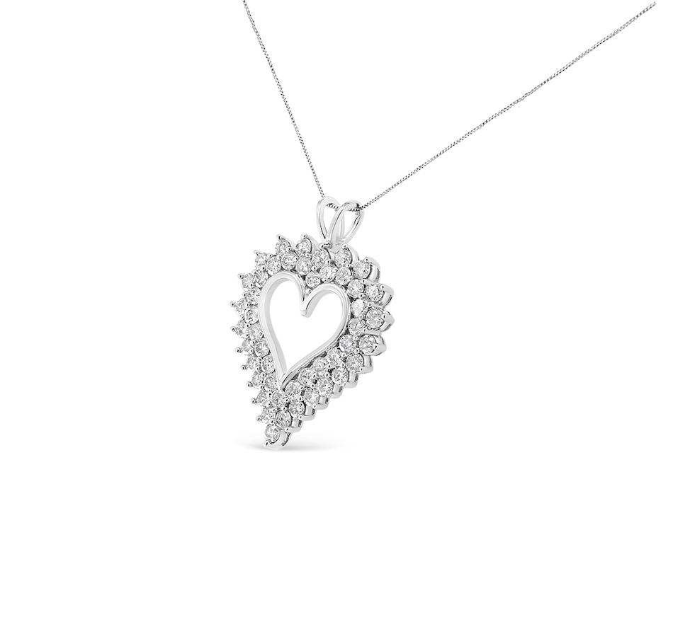 Feminine and sophisticated, this beautiful silver cluster heart necklace is the perfect gift for you or for the special lady in your life. This stunning pendant is crafted from genuine .925 sterling silver, a metal that will be tarnish-free for years to come. This 4 c.t. necklace is embellished with natural round diamonds in an alluring, double-row composite design. This piece comes with an 18" inch silver box chain for a safe and secure fit on your neckline.