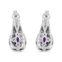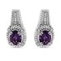 These resplendent amethyst and diamond earrings captures stunning feminine grace. Fashioned in sleek sterling silver, these earrings features a centrally staged oval cut amethyst engrossed by 12 pave set shimmering single cut diamonds embellished by a bright finish rope design on the borders. These treats closes with a secure clasp. Total diamond weight is 1/20 ctw and each amethyst measures 8x6 mm.
