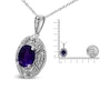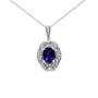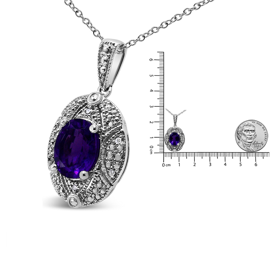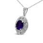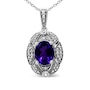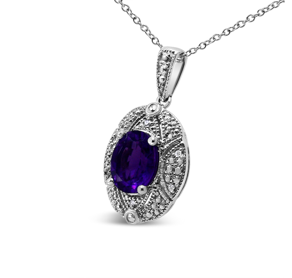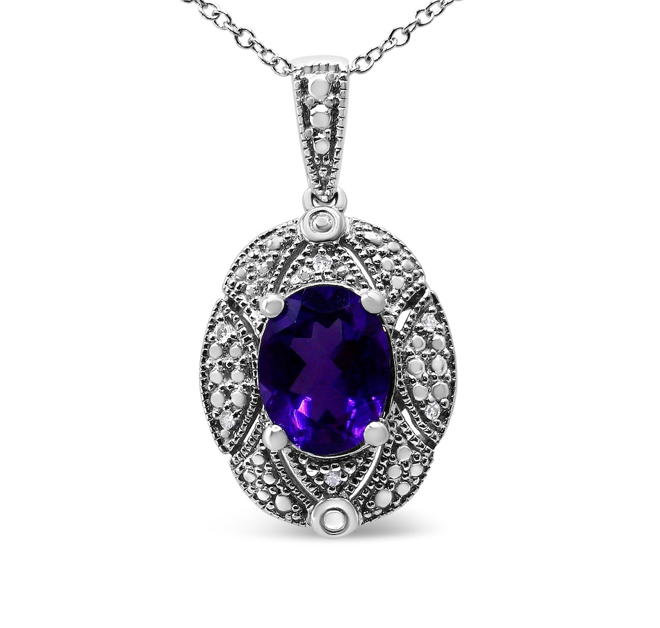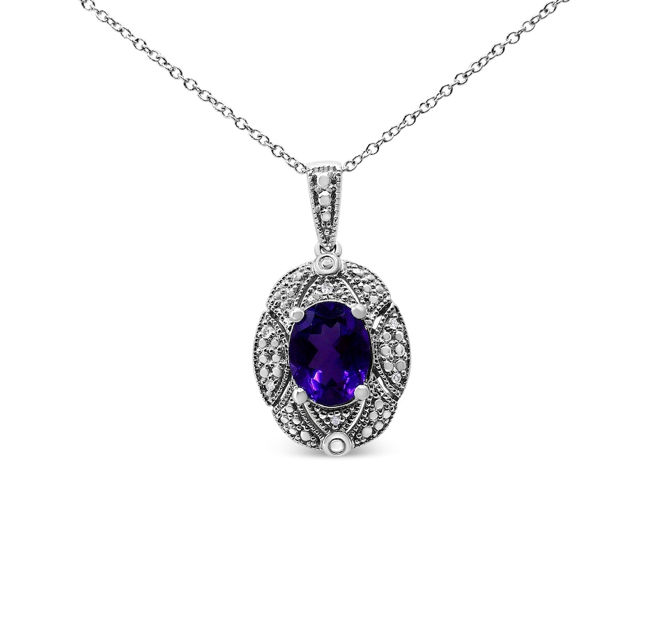 Intensify your look with the brilliant colors that radiate from this stunning diamond accent and gemstone pendant necklace! A gorgeous 9X7mm purple oval amethyst gemstone takes center stage in a sensational .925 sterling silver setting. The milgrain detailing and white round accent diamonds around the center stone create a classic, elegant and wearable piece jewelry that shines bright for every occasion. The prong set accent diamonds are of an approximate I-J color and I1-I2 clarity. The 18" cable chain complements any neckline beautifully, complete with a spring ring clasp. As the birth stone for the month of February, this amethyst gemstone pendant necklace makes a perfect gift for someone special in your life.