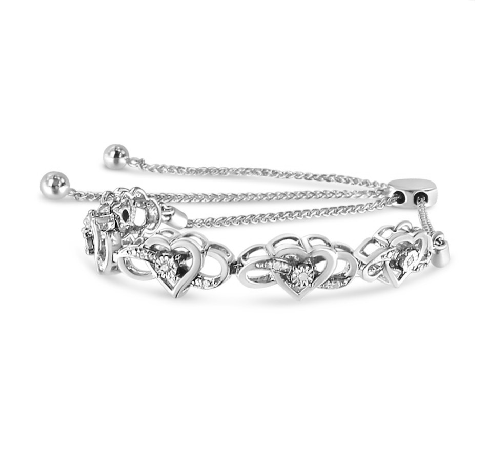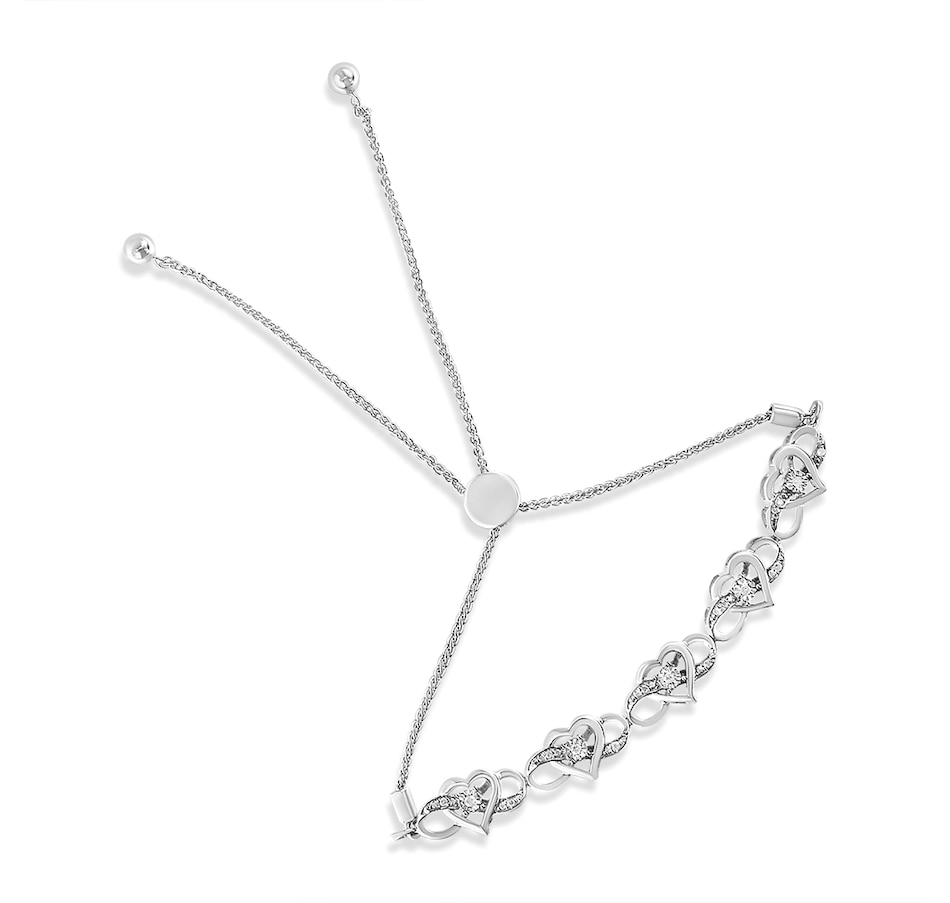 .925 Sterling Silver Miracle Set Diamond Accented Infinity Hearts 6”-9” Adjustable Bolo Bracelet (H-I Color, I2-I3 Clarity)