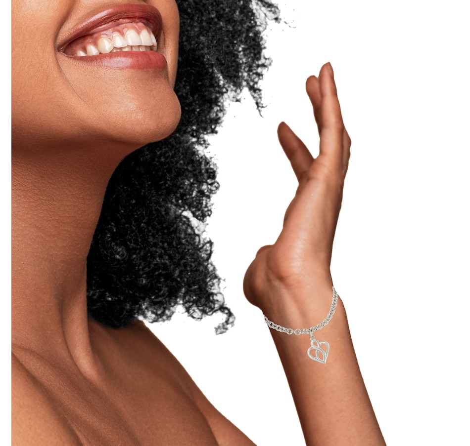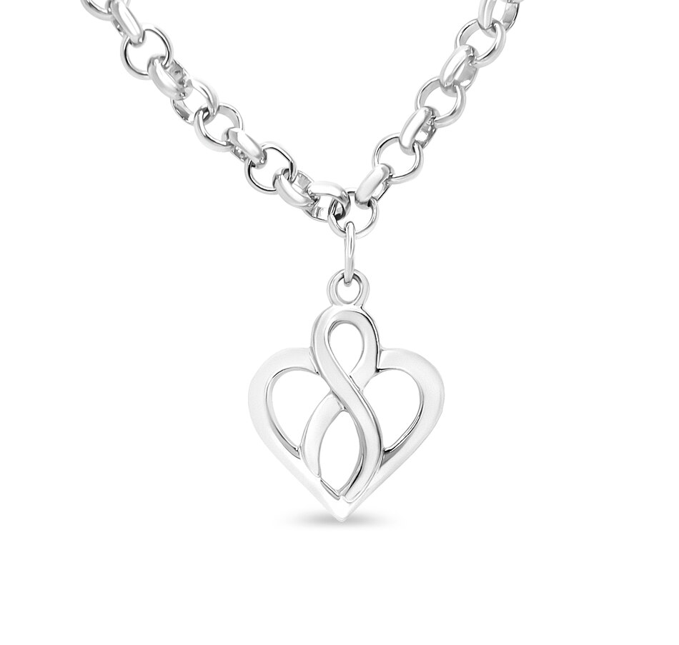 This fine .925 sterling silver pendant bracelet holds a meaningful message within its openwork silhouette. Graceful, sweeping lines of sterling silver first form an open heart shape, and center there is an infinity symbol which represent timelessness in a never ending cycle. This bracelet fastens securely with a spring ring clasp. It is 7 inches long, best for small and medium sized wrists.