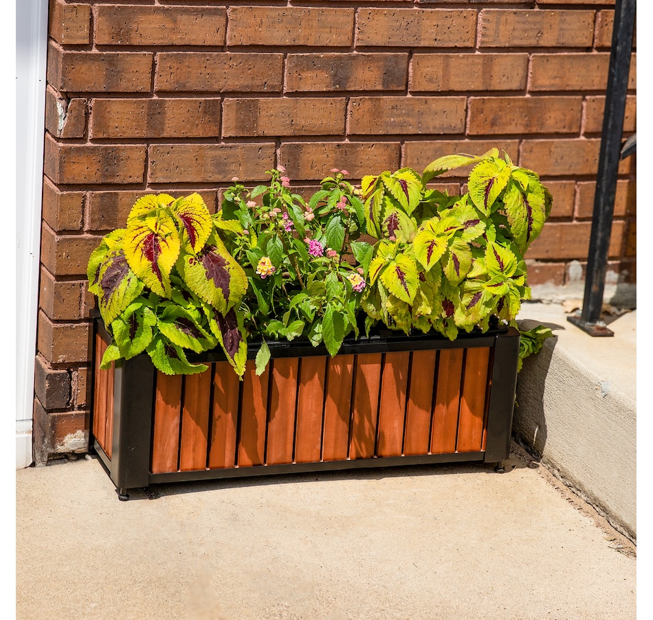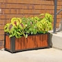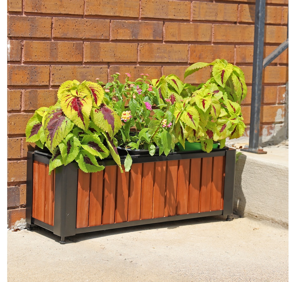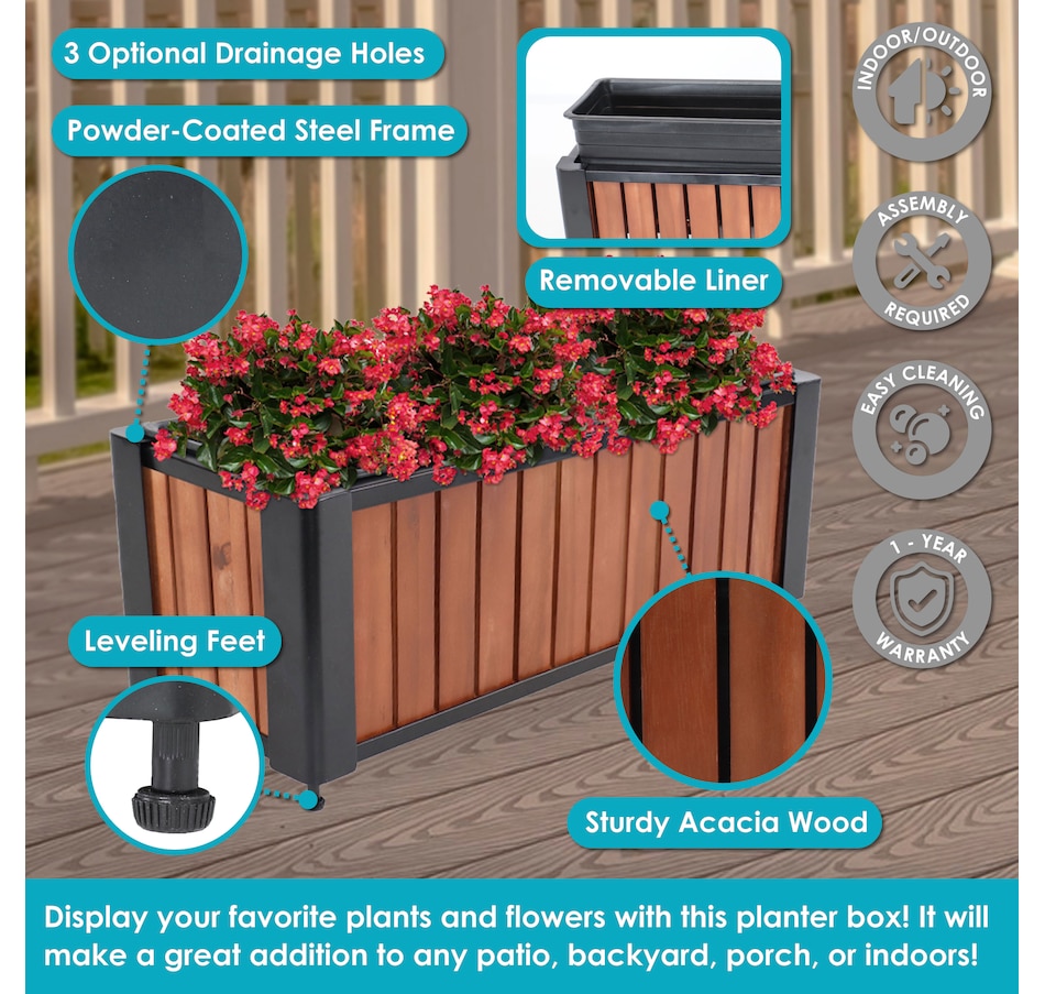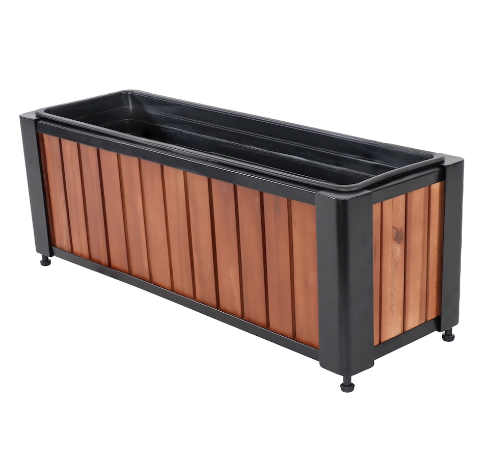 Add a touch of industrial style to any outdoor space with this outdoor rectangular wood planter. This wood raised garden bed can be used to plant a variety of plants and flowers. This stylish garden bed is made of durable acacia wood for lasting strength and beauty season after season. Plus, this garden bed includes a removable insert that is made from polypropylene and features 3 holes for the proper drainage. It features a powder-coated steel frame in classic black and a planter box made from acacia wood for a natural look that will complement any outdoor decor style. This elegant wood rectangular planter box is a sophisticated addition to the patio, deck, front porch, or backyard.