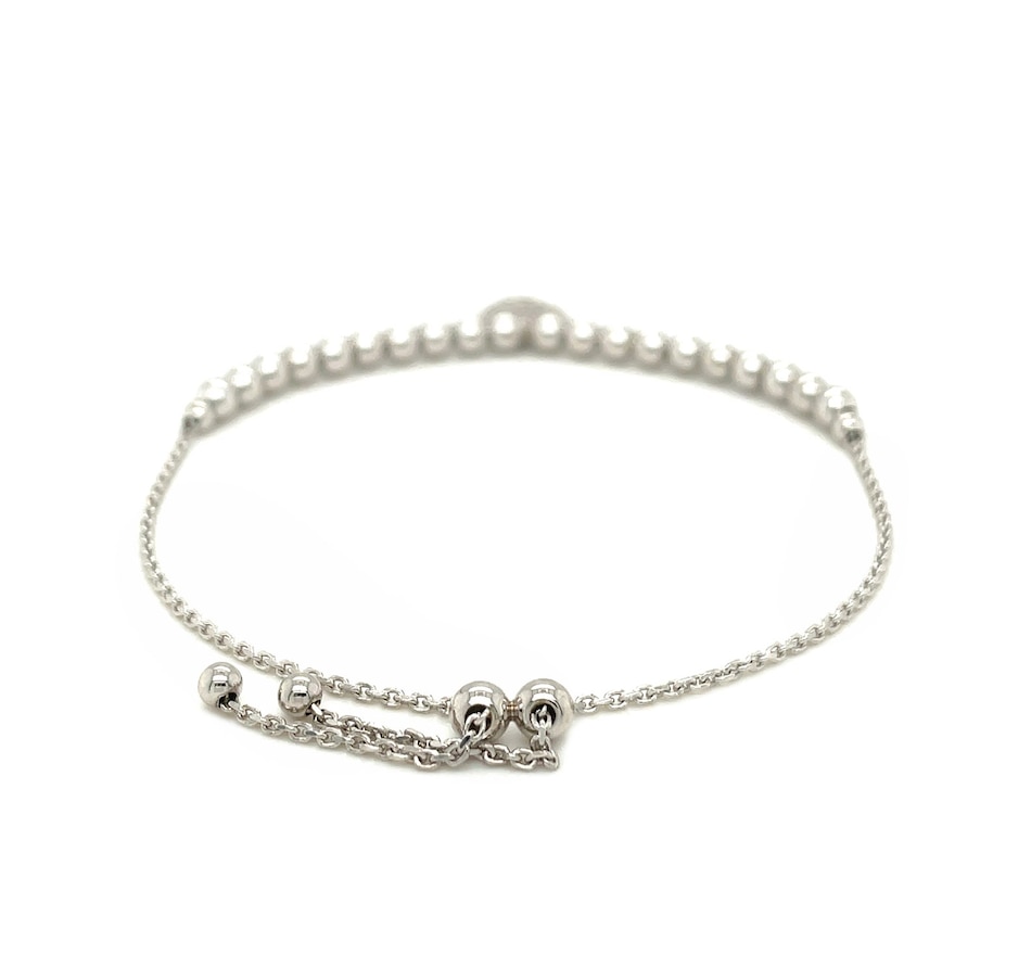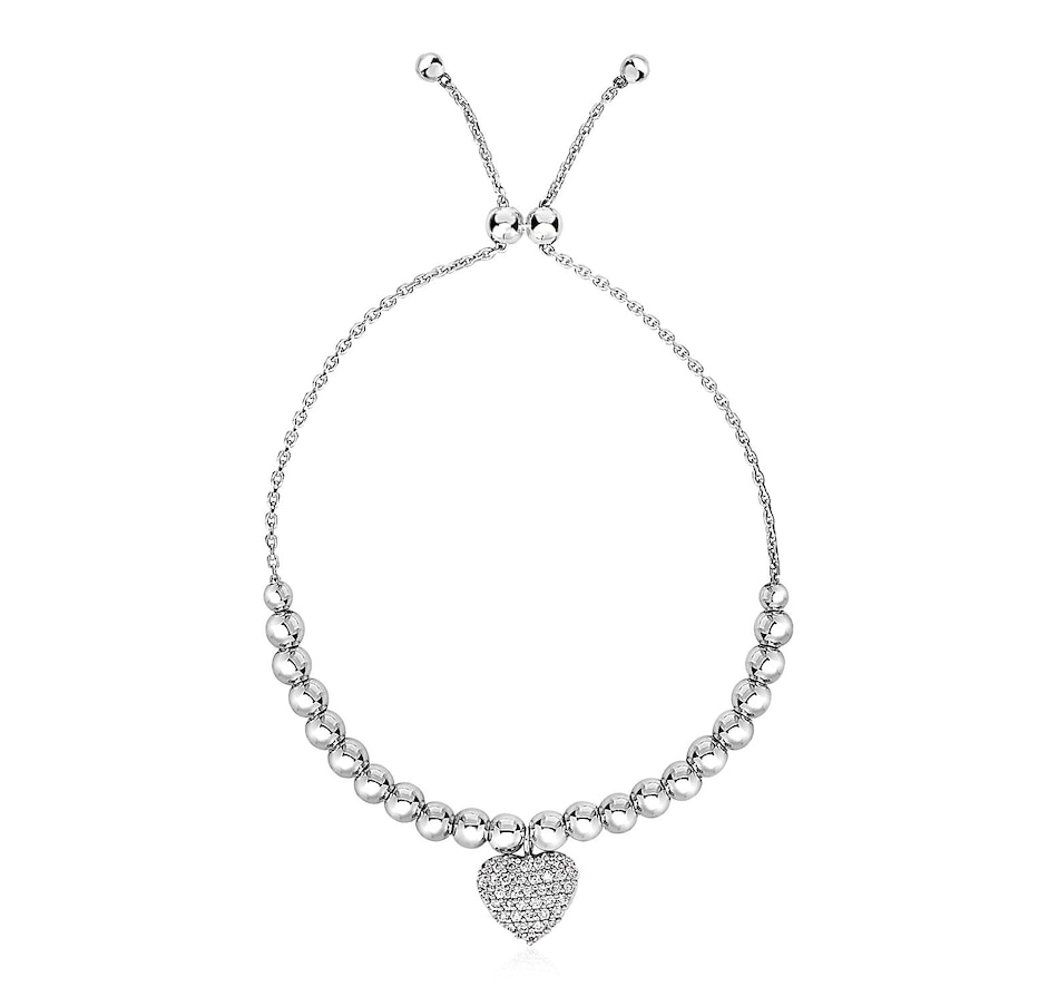 A glittering heart shines with Cubic Zirconia at the center of this adjustable sterling silver beaded bracelet. Bracelet closes with a drawstring clasp.