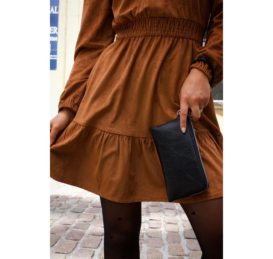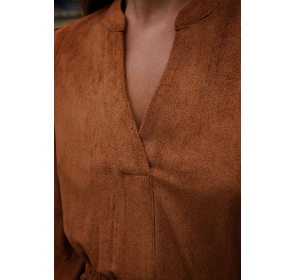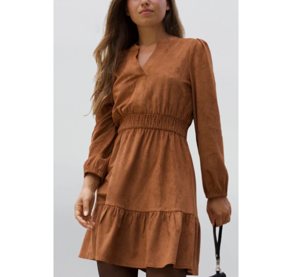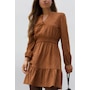 The Adrienne Smocked Waist Dress is the epitome of effortless sophistication. Rendered in a warm, earthy brown tone, this piece is designed to flatter with its subtle V-neckline and cinched smocked waistband that enhances your natural shape while offering all-day comfort. The soft, fluid silhouette is complemented by long sleeves and a tiered skirt that creates gentle movement. Perfect for dressing up or down, this versatile dress easily transitions from casual brunches to evening outings with a simple change of accessories. Characteristics: Fabric: 90% Polyester 10% Elastane Length: 36 1/2" (small) Color: Warm Brown V-neckline Smocked elastic waist for comfort and shape Long sleeves  Ruffled dress Our sizes run a little large due to our comfortable fits and relaxed silhouettes