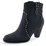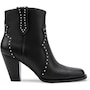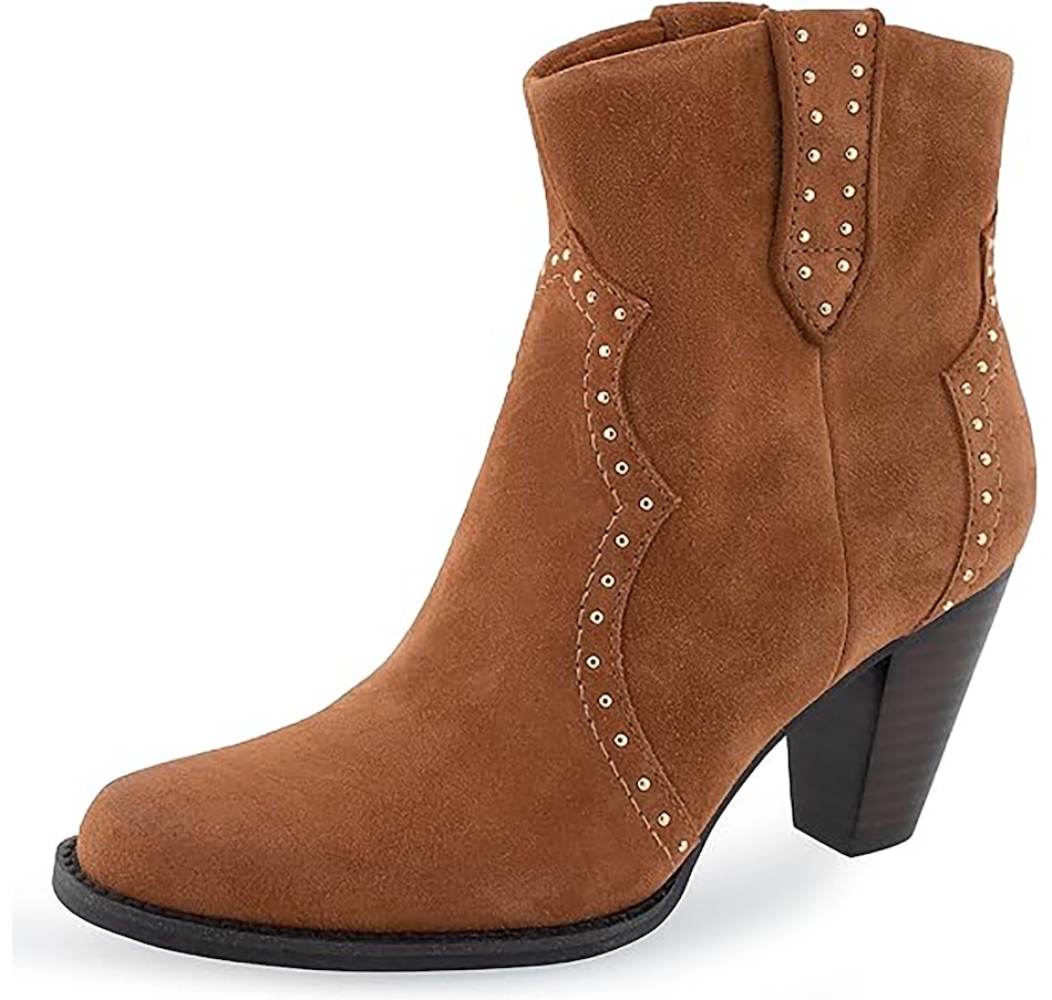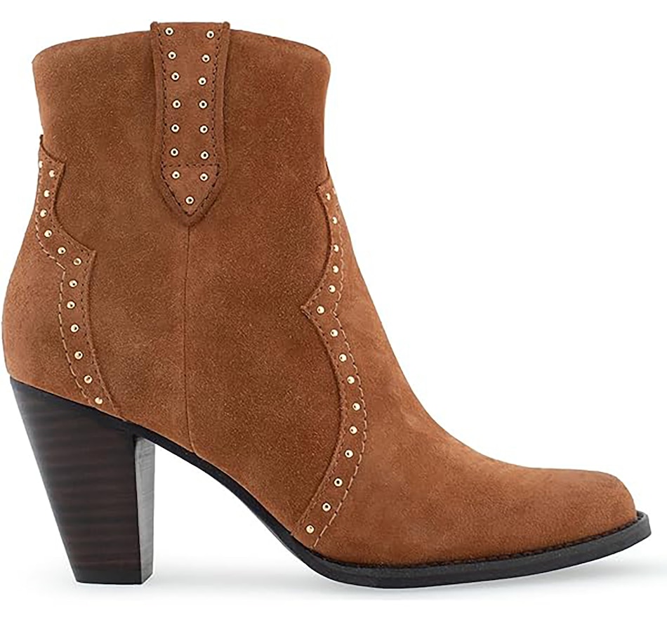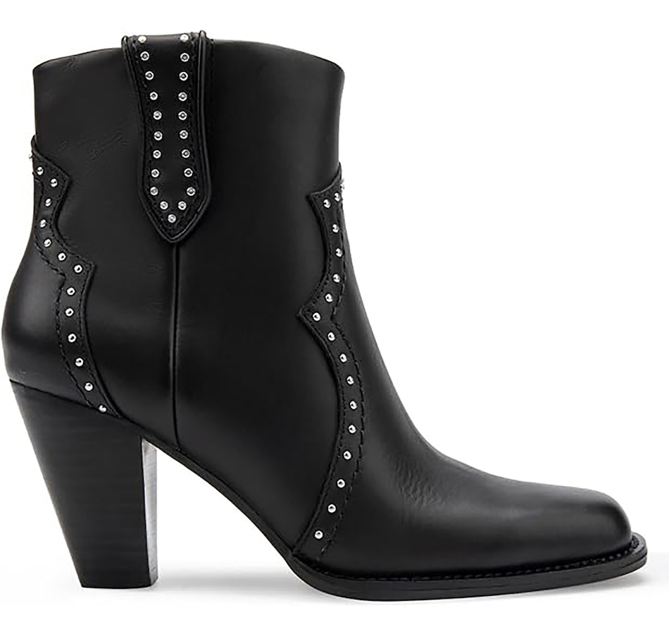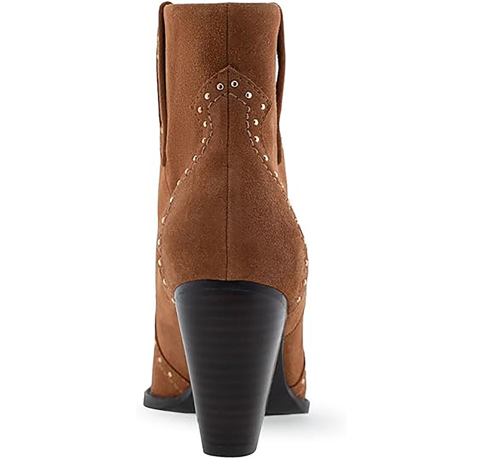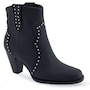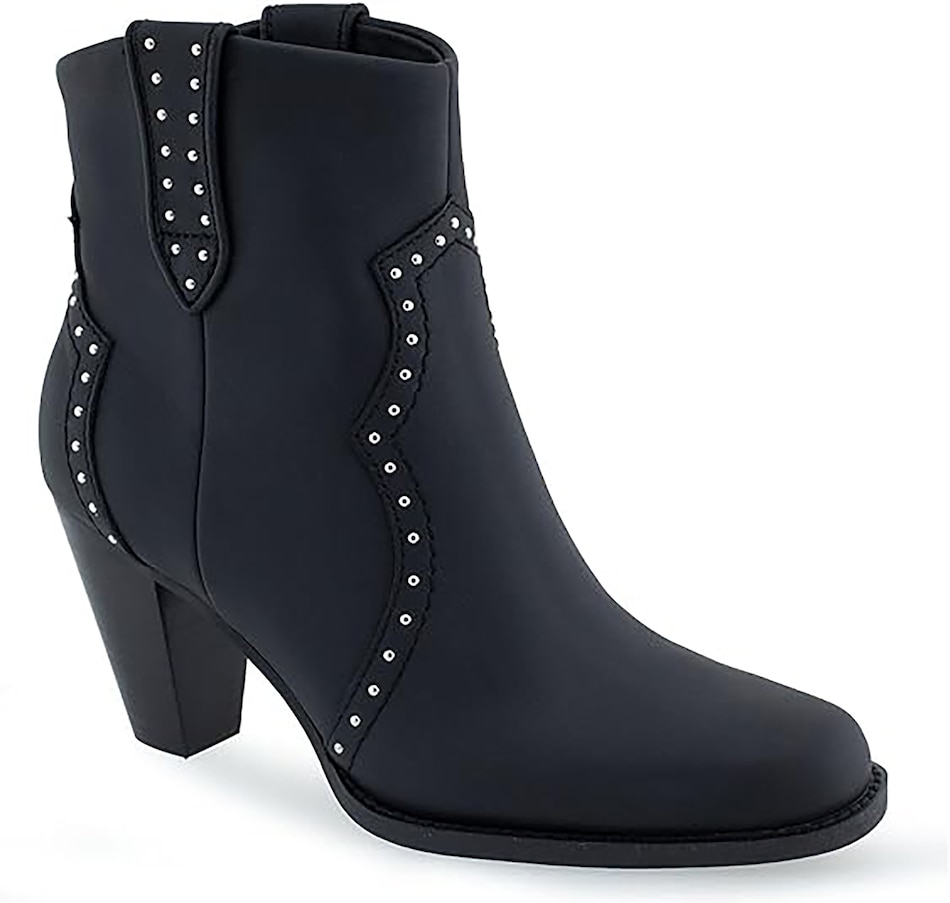 It features a traditional rounded square toe and chunky heel, and it finishes with dual side tabs and stud detail.