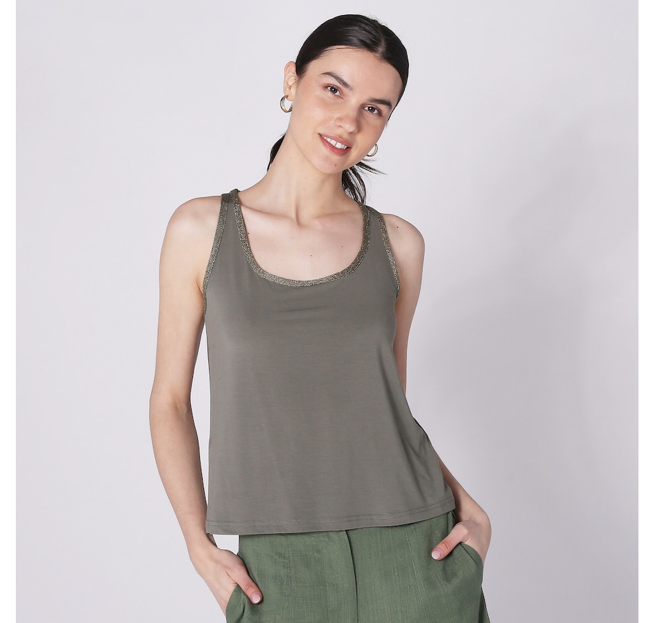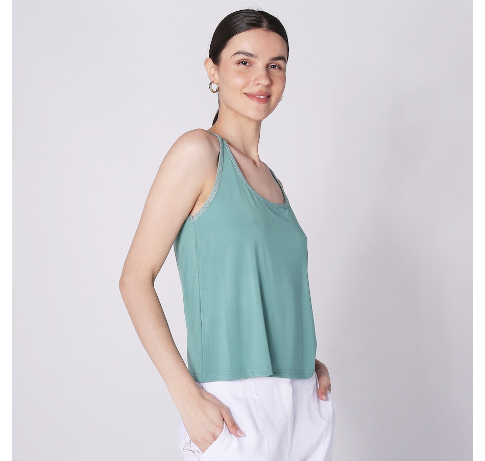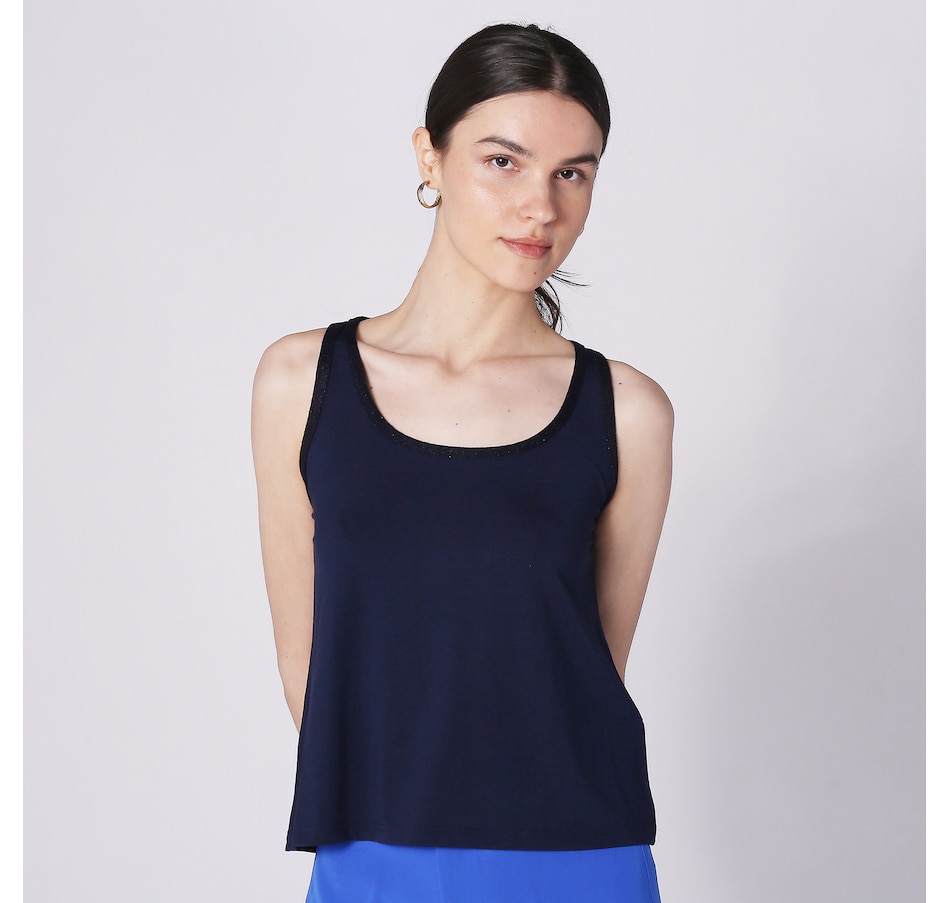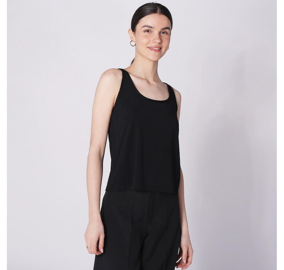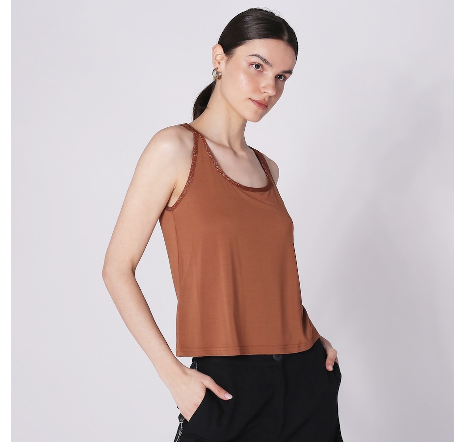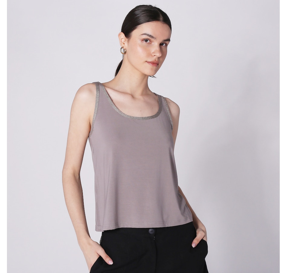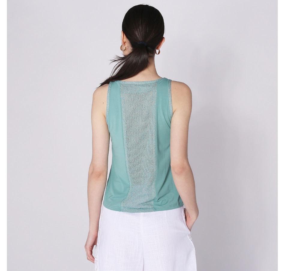 Available in a wide range of beautiful colours, you'll centre every look in style wearing this jersey sleeveless top with knitted details from Aggel Knitwear.