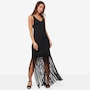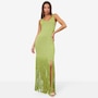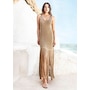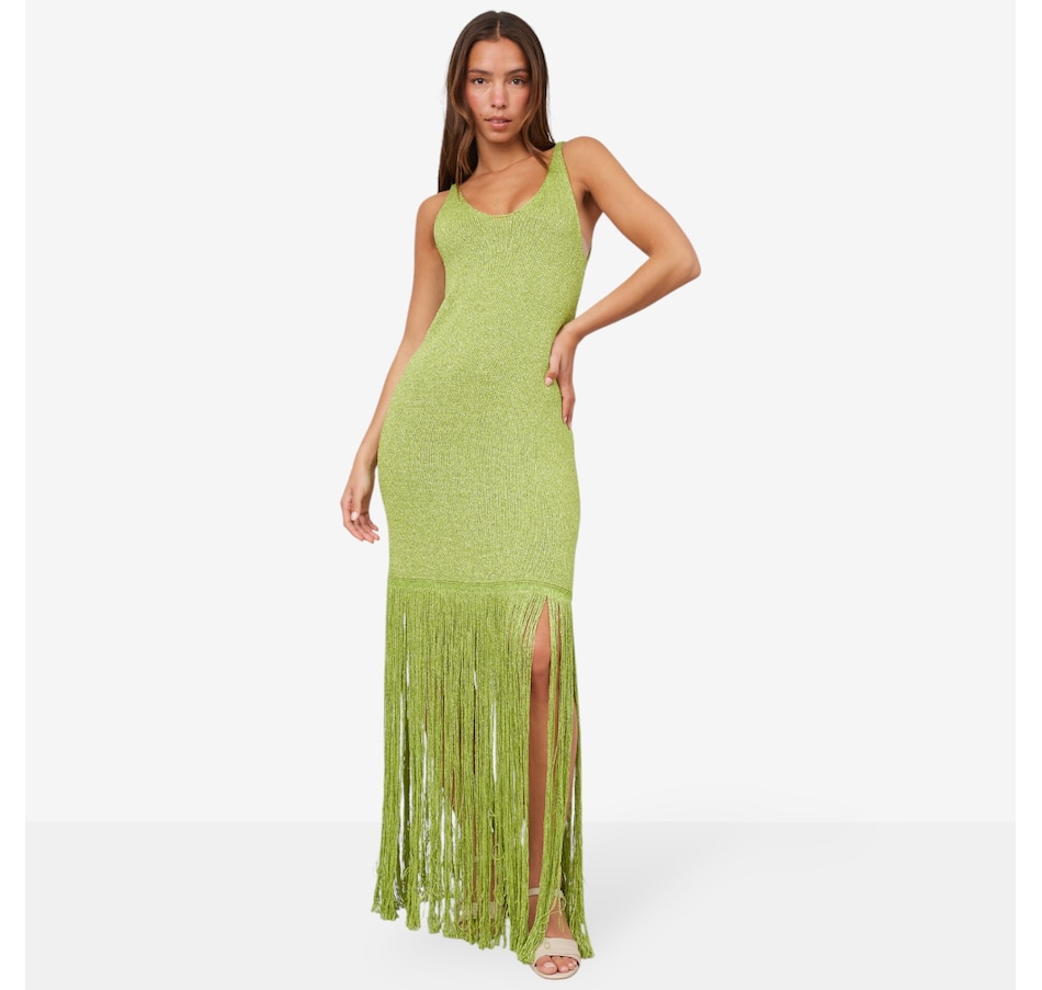 A fitted, sleeveless metallic knit dress from Aggel Knitwear with fringe details, designed to make a bold statement.