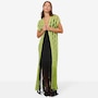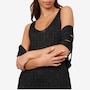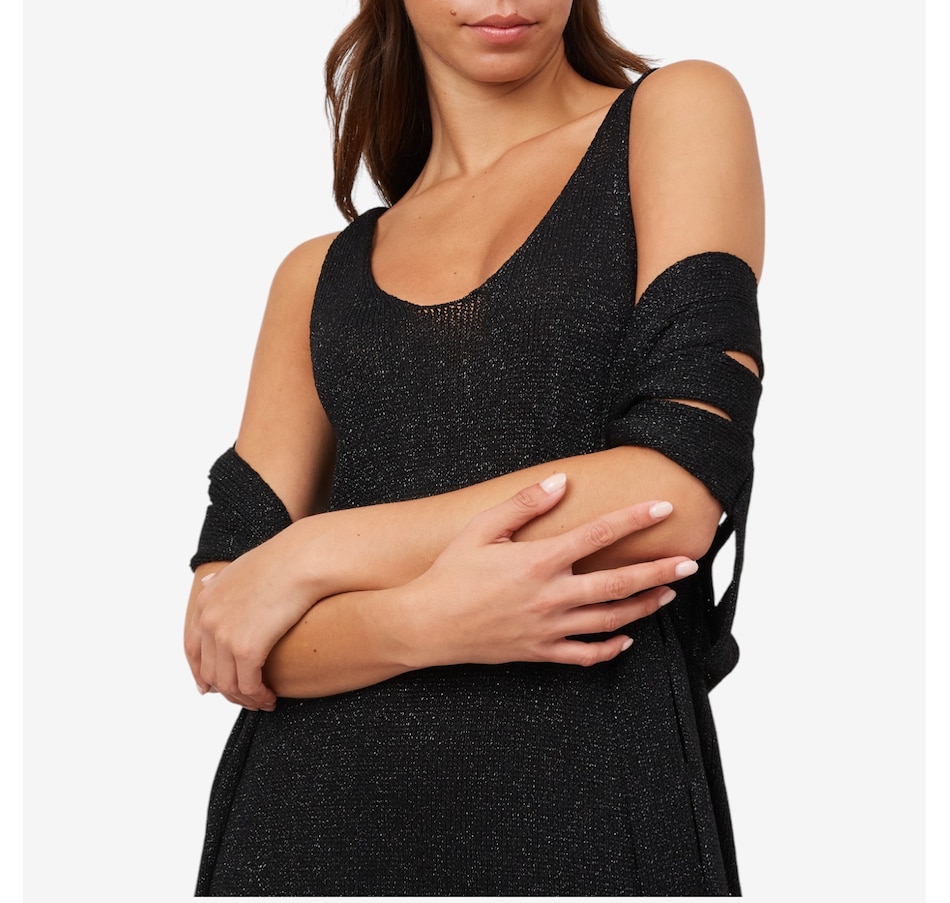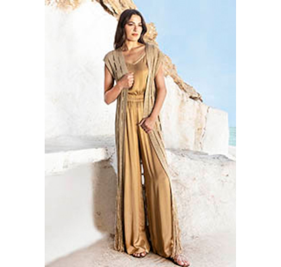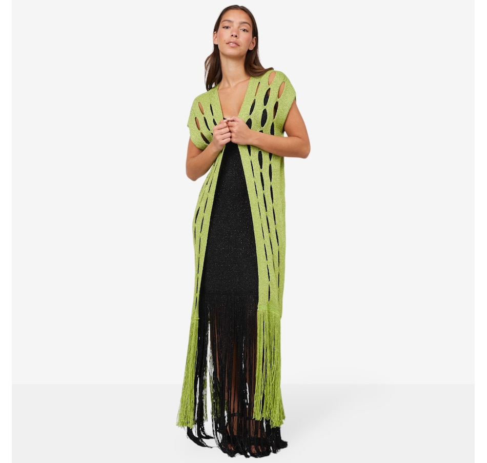 A stylish and relaxed cardigan from Aggel Knitwear featuring metallic open-knit design and long fringed details.