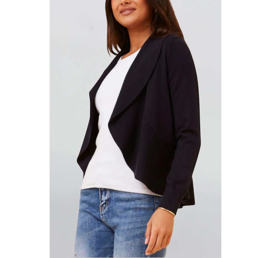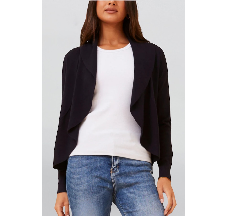 Stay stylish and comfortable with this women's black open-front cardigan, perfect for layering year-round. Featuring a flattering draped waterfall design, this lightweight knit sweater adds a touch of elegance to any outfit. Whether you're dressing for the office, casual outings, or weekend brunch, this versatile cardigan pairs effortlessly with jeans, leggings, or your favorite dresses. Made with soft, breathable fabric, it offers all-day comfort while keeping you polished and put-together. An essential wardrobe staple for work, travel, or everyday wear.