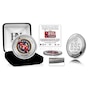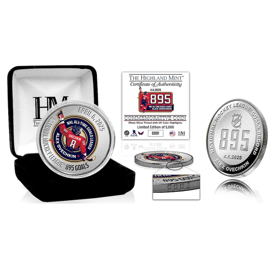 This limited edition silver-plated coin is minted to commemorate Alex Ovechkin setting the new NHL Career Goals Record of 895. The front features the official Ovechkin goals record logo with the commemoration and date. The reverse is minted with 895 and details of the record. Each coin is individually numbered on its edge as well as protected in a clear capsule to preserve its condition, and delivered in a black velour jewellery box. Available in a limited edition of only 5000 and officially licensed by the NHL and NHLPA, each coin is accompanied with a certificate of authenticity. This product is made in the USA by The Highland Mint.