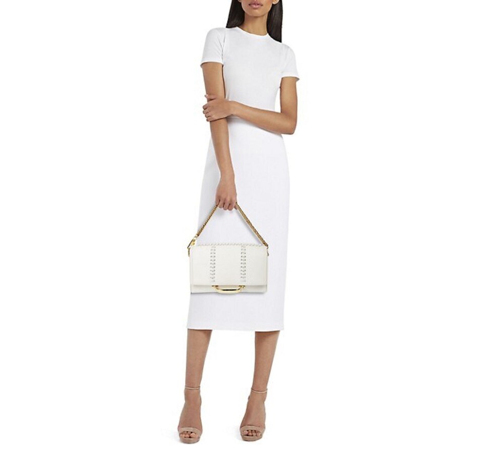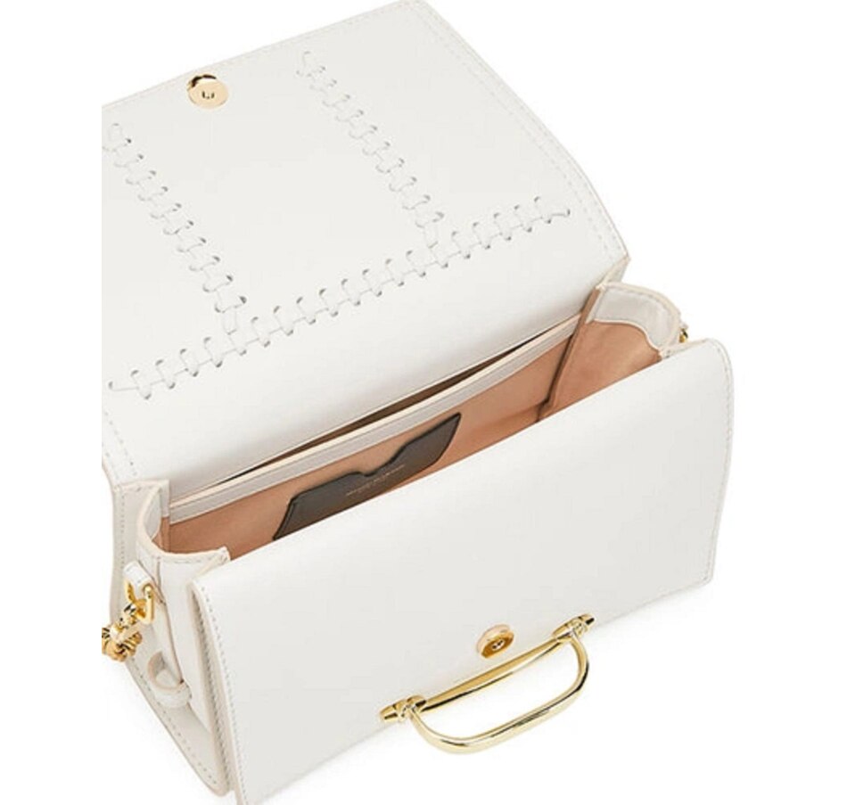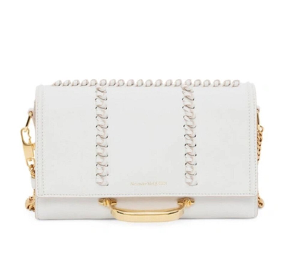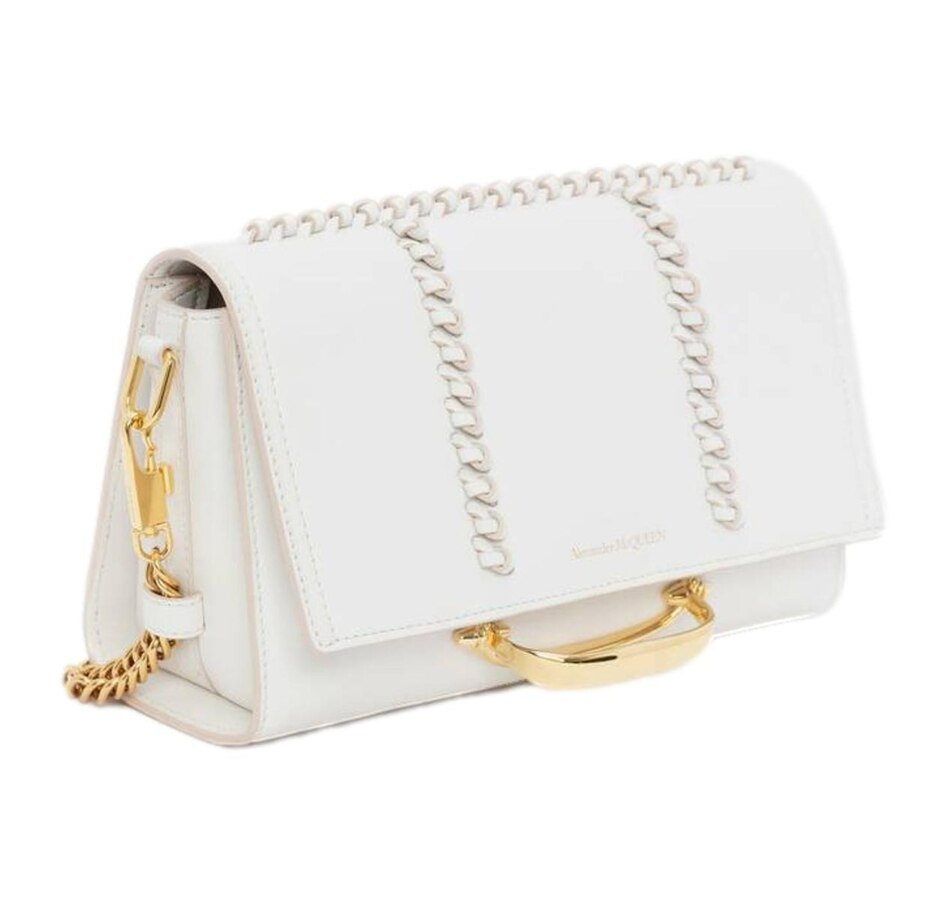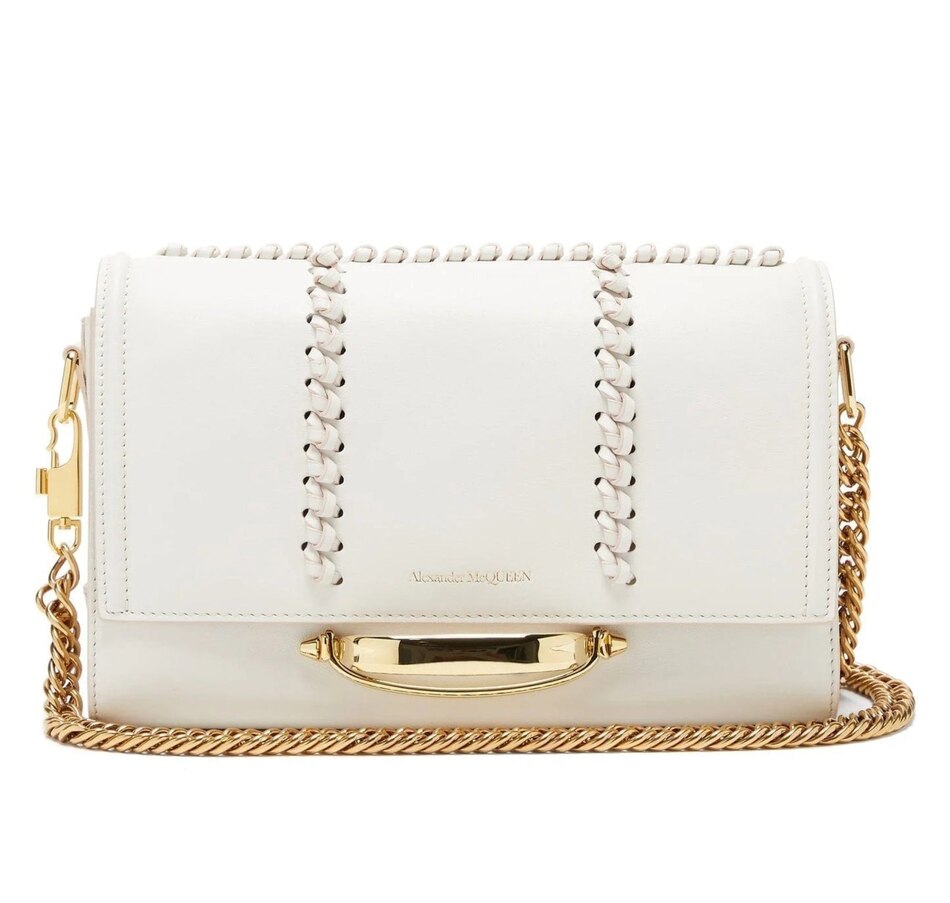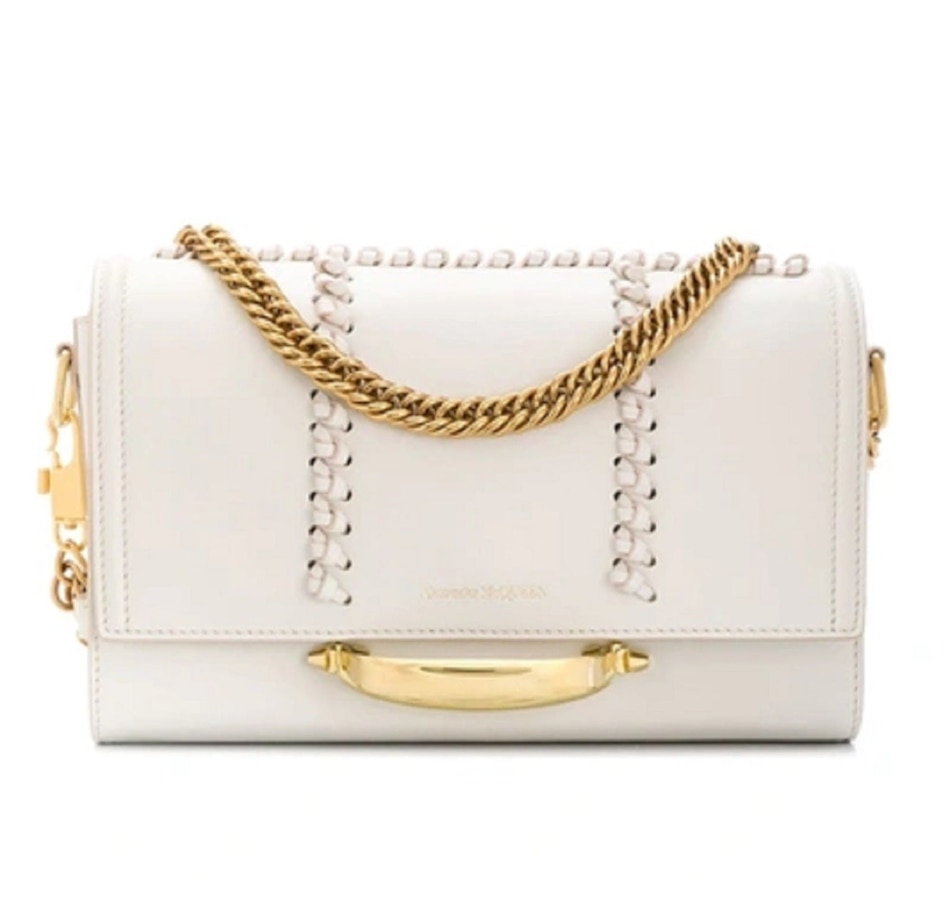 Taking a walk on the romantic side just got a lot easier with Alexander McQueen's sleek The Story shoulder bag. Putting a new-season update on one of its signature styles with the addition of a polished chain strap, the British House brings its exquisite craftsmanship to the fore with the silhouette's smooth leather offset by tonal knots. Look to the gold-tone handle to the front flap which serves as the perfect accent to slip your hand through and carry the silhouette as a clutch. Model:631473 Ivory Whipstitch Leather Gold-tone hardware Fold-Over Flap With Magnetic Closure  Suede interior lining One interior slip pocket  Detachable strap Strap drop: 15" Measurements: 11" x 4.5" x 7.5" (LWH) Includes authenticity cards and Alexander McQueen dust bag Made in Italy