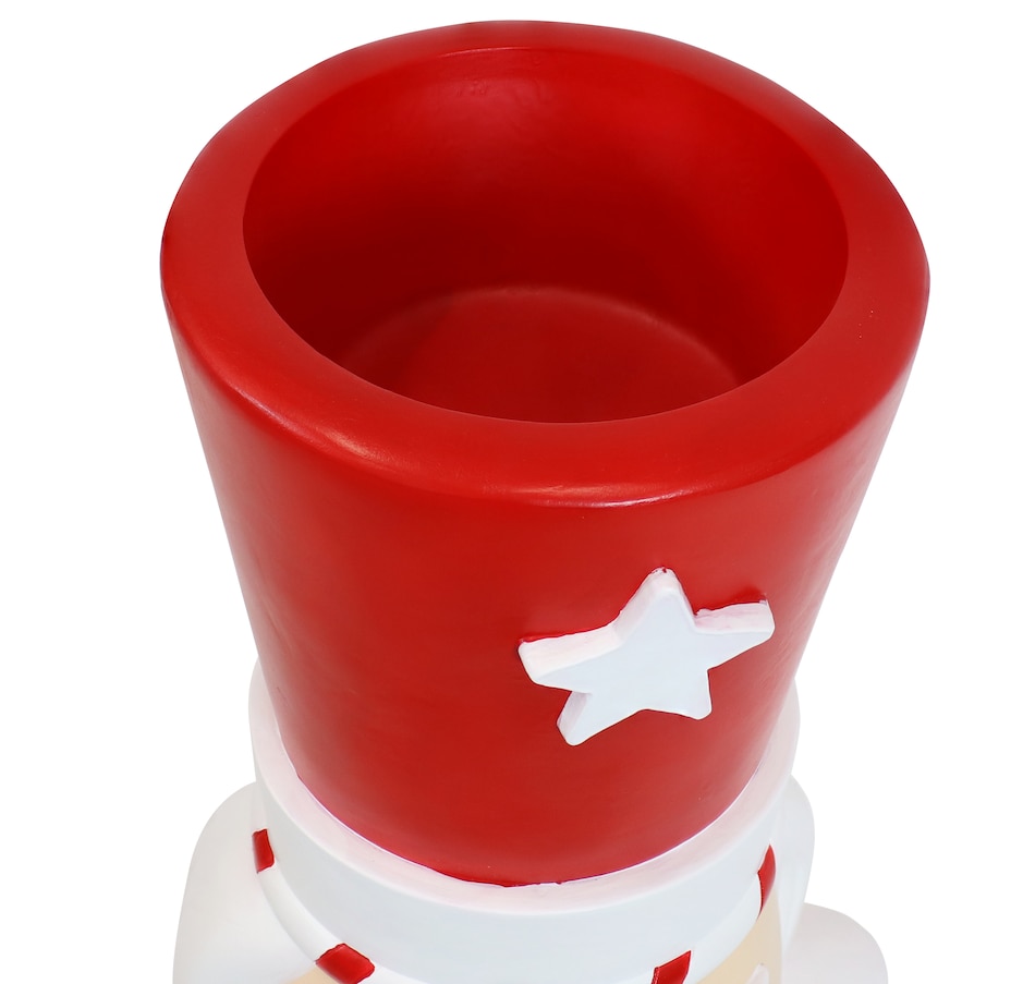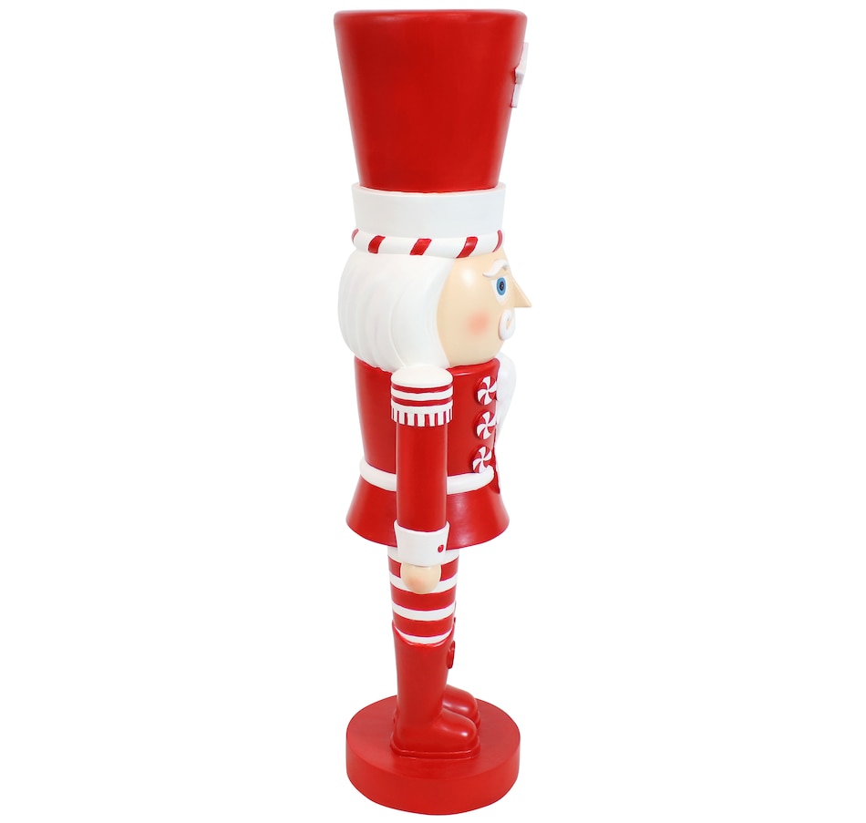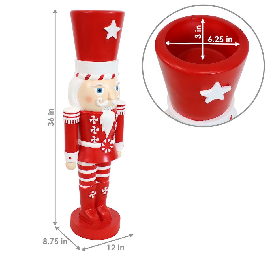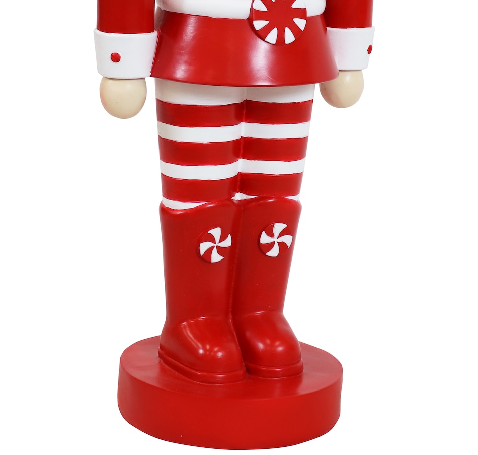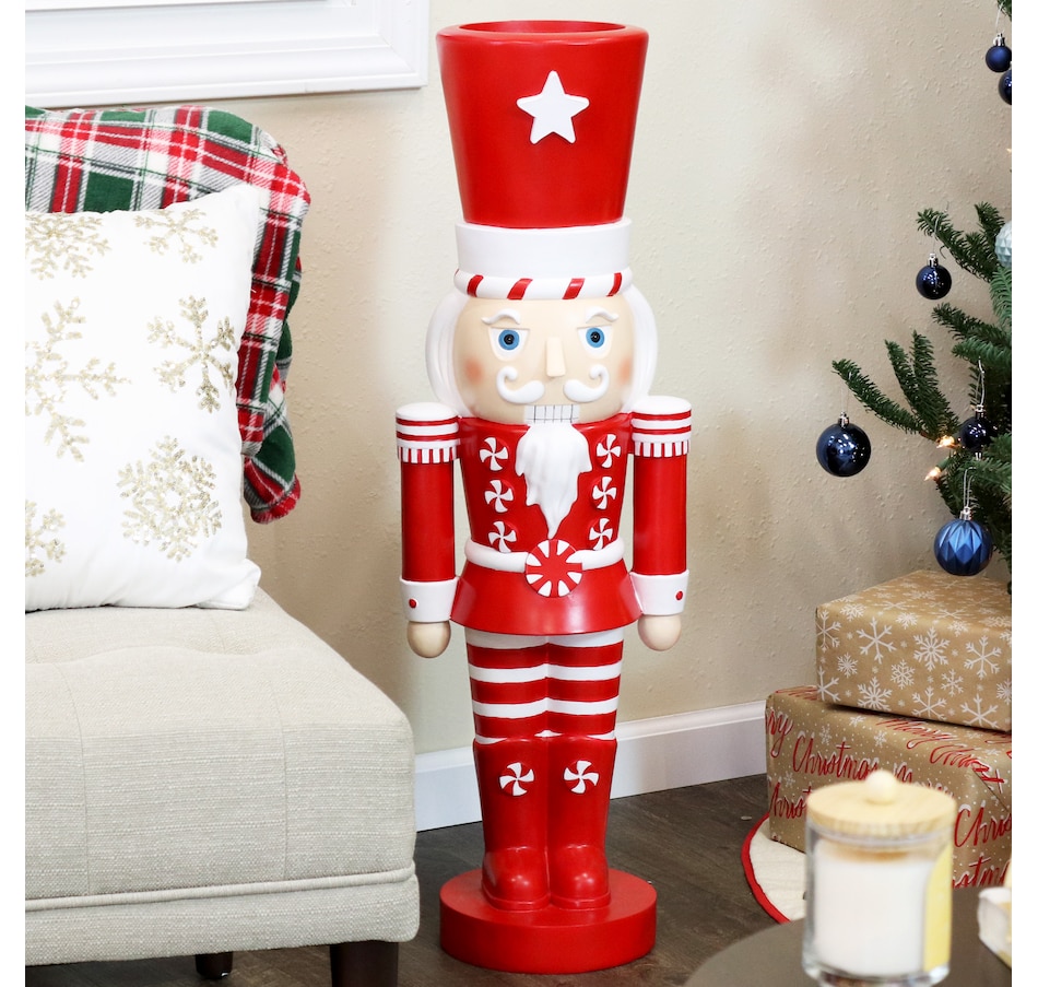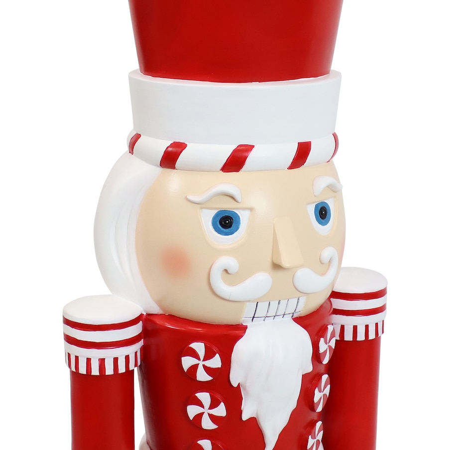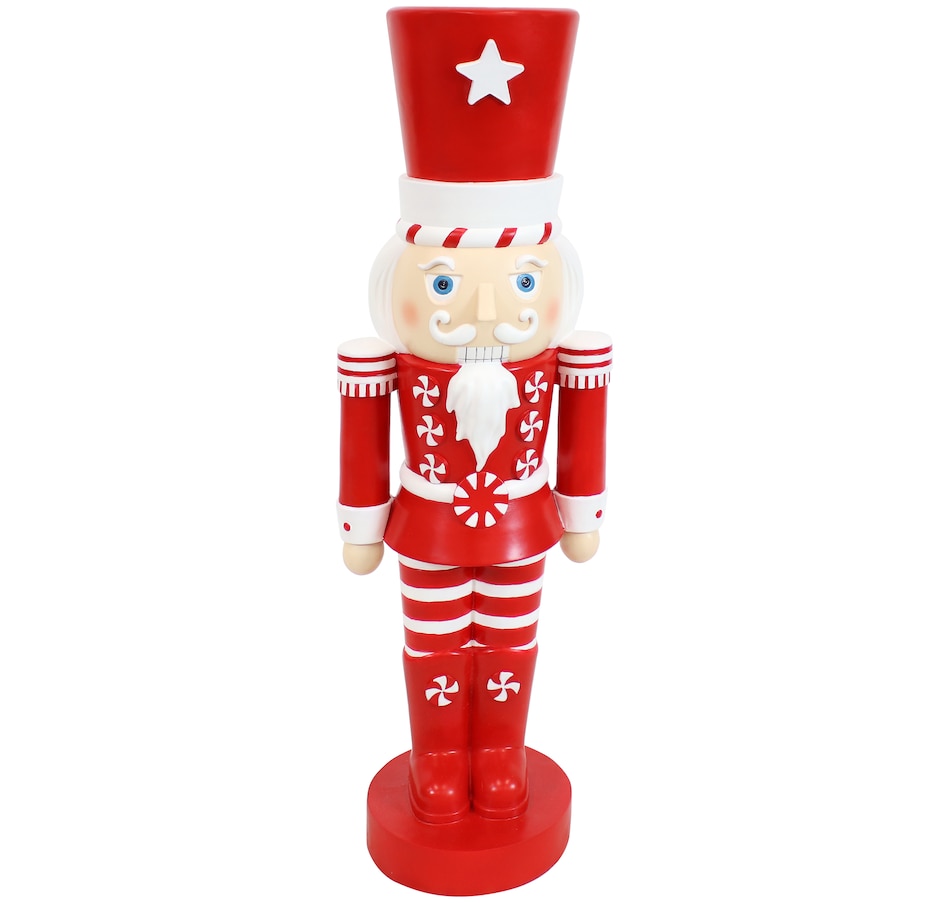 Deck the halls inside or outside the home with this indoor and outdoor Christmas nutcracker statue. Great for homeowners looking to enhance their Christmas decor, the festive, tall nutcracker soldier stands at attention with his feet together and his arms down while looking straight ahead. Used by holiday decorators and homeowners alike, Alfonso the Noble Nutcracker features a long-lasting polyresin and fiberglass construction and a hand-painted finish. Inspired by candy canes, his red and white coloring works together to create a traditional Christmas design. Place him anywhere inside or outside the home. The holiday nutcracker figurine would make a great accent on the front porch, on the deck, in the front yard by the entry door, or in the garden. Indoors, the large nutcracker figurine would create an eye-catching display near the mantel, in the foyer or entry way to welcome guests, by the tree in the living room, in the hallway, or dining room. Great for those who love classic Christmas themes and nostalgic holiday decor, Alfonso is a must-have for festive homeowners and Christmas enthusiasts.
