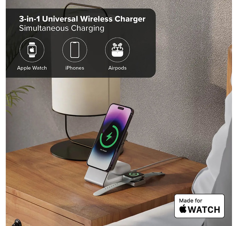 This charging stand can simultaneously charge your phone (15W), AirPods (5W) and Apple Watch (2W), and also comes with a 30W USB-C wall charger for fast charging.