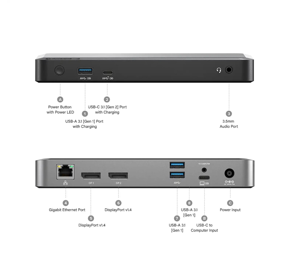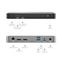 • Ports: (1) USB-C upstream (for host connection, supports 65W PD); (2) DisplayPort 1.2 (4K 60 Hz); (1) HDMI 2.0 (4K 60 Hz); (3) USB-A 3.1 Gen 1 (5 Gbps); (1) USB-C 3.1 Gen 1 (5 Gbps, data only), (1) Gigabit Ethernet; (1) 3.5-mm audio combo jack (headphone/microphone); (1) SD card reader (UHS-I); (1) microSD card reader (UHS-I)