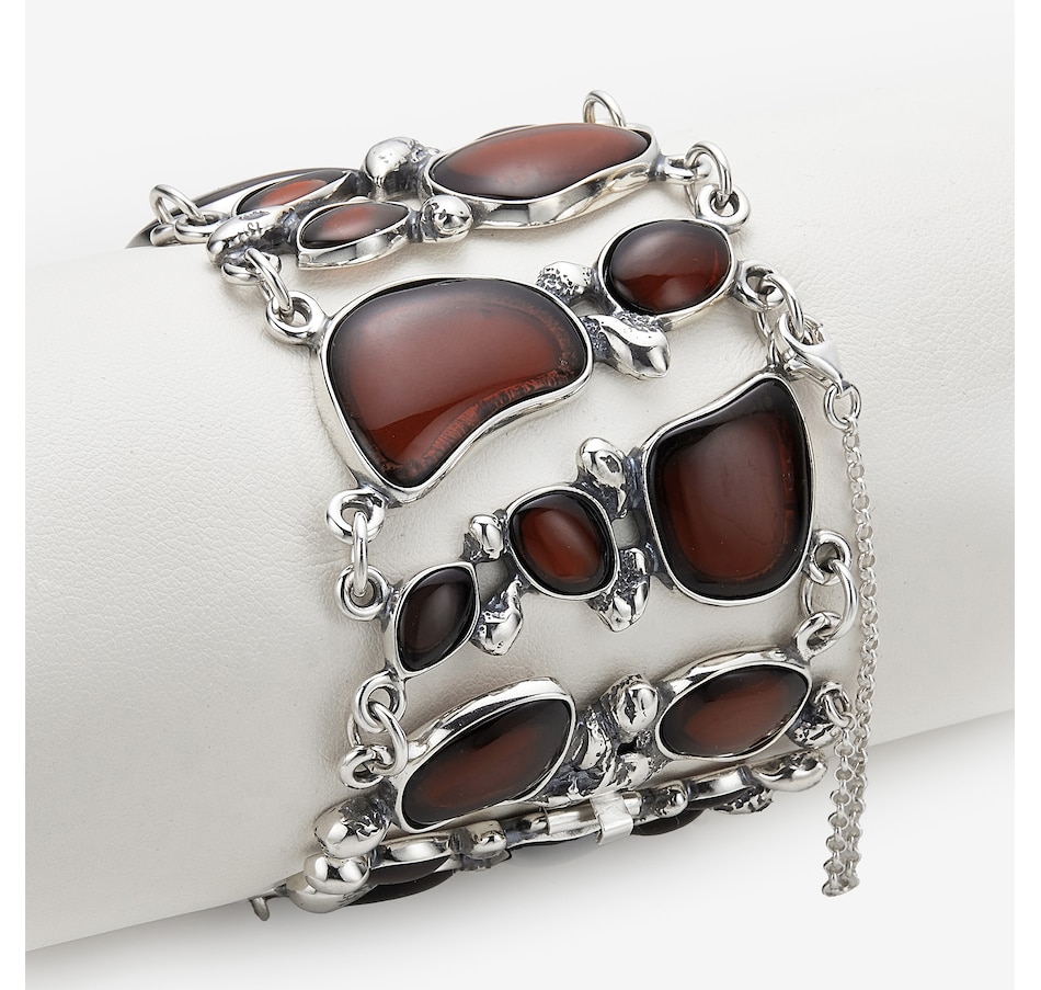 This wide bracelet from the Handmade Collection showcases an expressive arrangement of freeform amber stones in rich, natural hues. The substantial design highlights organic variation and depth of colour, creating a bold statement with artisanal character. It’s a striking piece that brings warmth and individuality to the wrist.
