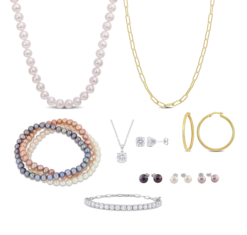 Create all kinds of different looks with this fabulous jewellery collection from Amour Pearls.  This comprehensive 12-piece boxed set includes stud earrings, a bracelet, a pearl necklace, a pendant and chain, pink stud earrings and a pink pearl stretch bracelet, and all encased in a beautiful gift box.