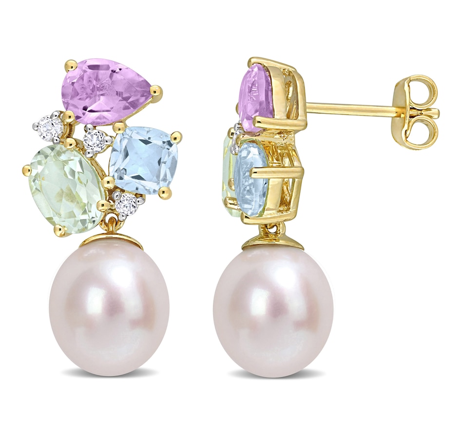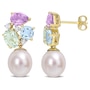 Sterling Silver Yellow Gold Plate 9mm-9.5mm Cultured Freshwater Pearl And Gemstone Drop Earrings