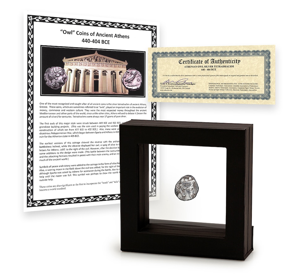 This coin features exceptional high-relief images on both sides and is one of the first coins ever to feature any type of detailed designs on both sides. The engraved struck female image is of Athena, the patron goddess of Athens. The other side features an intricately engraved owl based on the coat of arms of the city of Athens. The image includes an olive sprig and a crescent-shaped moon. As every coin was struck by hand and the original dies lasted for only a short time, every coin is slightly different.