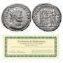 On the reverse are one of the various gods and goddesses of the Roman pantheon. While struck primarily in bronze, the coin was "silvered" to have the appearance of a regular silver coin when issued. A certificate of authenticity and information page about the emperor is also included.
