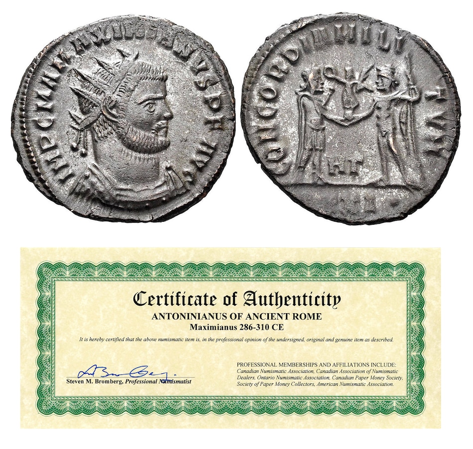 This high quality antoninianus coin is an original artifact dating back to the era of the Roman Empire more than 1,700 years ago. It dates from the reign of Maximianus I and was issued from 286 to 310 CE. On the obverse of the coin is a radiate bust of the emperor in a classic style of early fourth-century century Roman art.