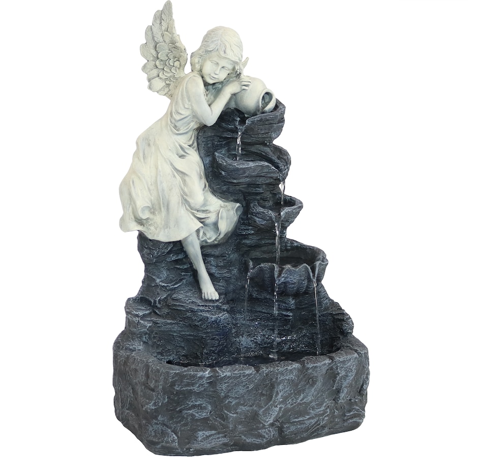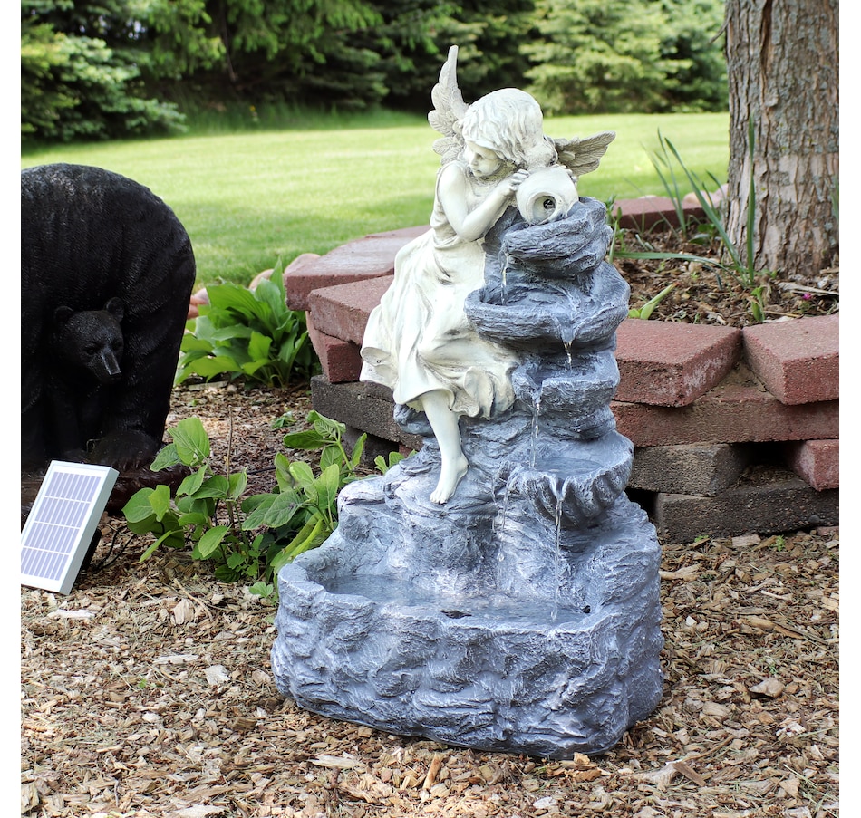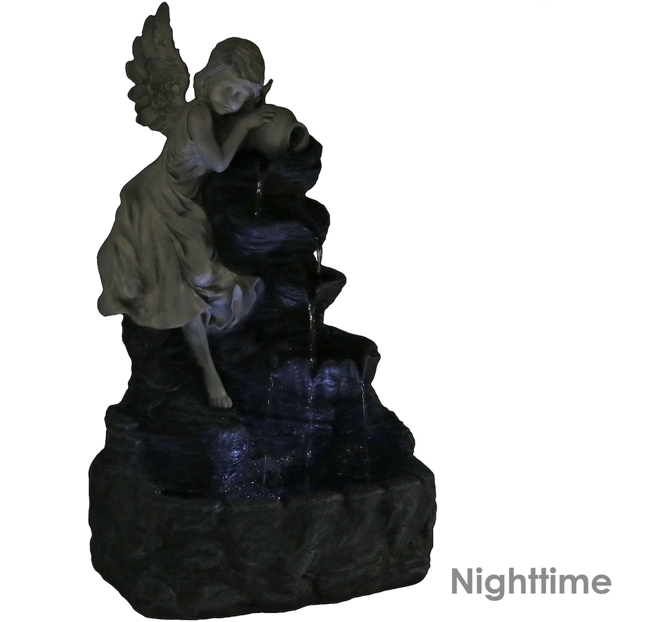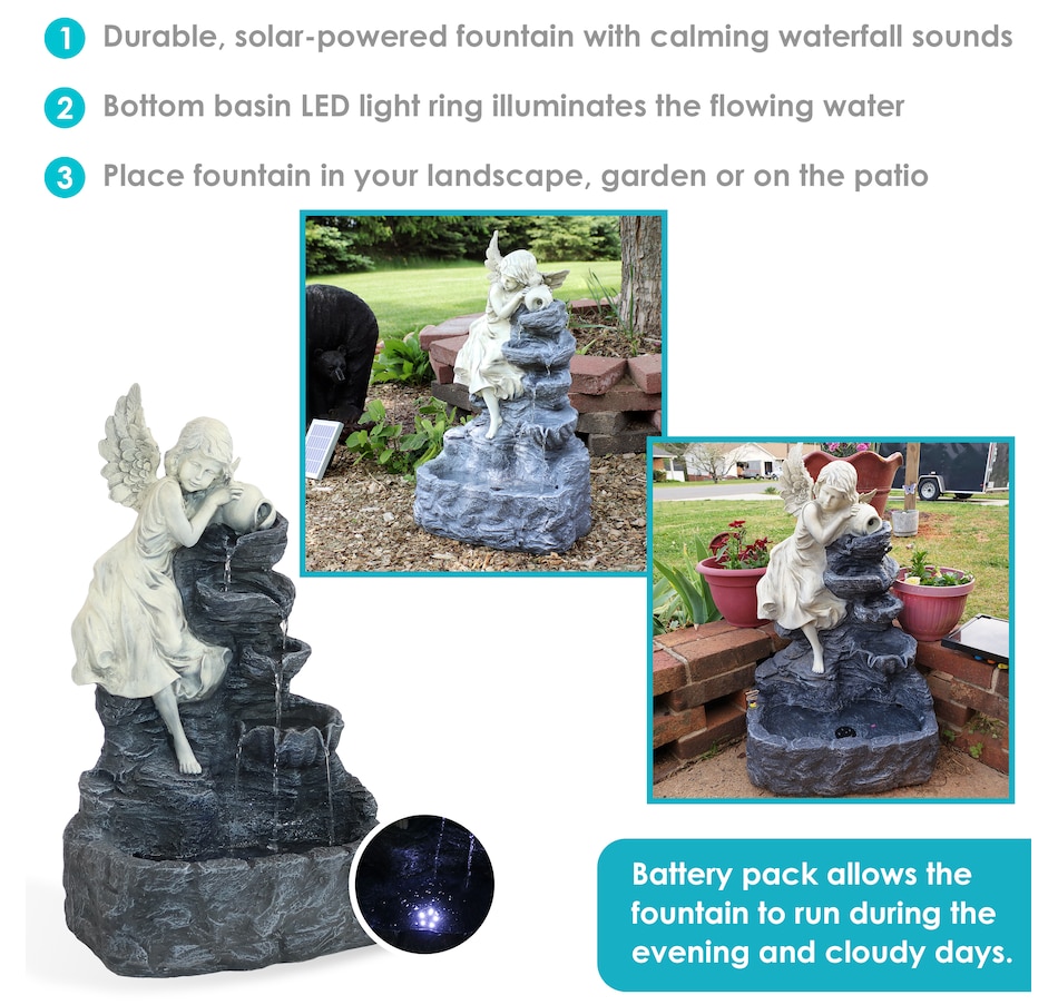 Add an inspiring water feature to any landscaping, garden, patio, backyard, front porch, or other outdoor area with this Angel Falls solar-powered water fountain. This fountain features a statuesque angel with a vase standing atop a rocky waterfall stream that features six waterfalls throughout the 5 tiers. Constructed from durable and easy-to-maintain polyresin, this fountain is lightweight enough to move around easily while remaining durable and resistant to the elements outdoors. With the solar panel, this fountain relies on solar energy for power. When the solar panel is in direct sunlight, the pump will be powered by solar energy and the battery pack will recharge. Once fully charged, the battery will power the fountain for up to 4 hours. The battery will also automatically run the fountain when it is cloudy or nighttime. Place this stunning, detailed fountain anywhere and watch any space illuminate with soothing sounds and beautiful views.