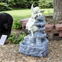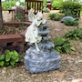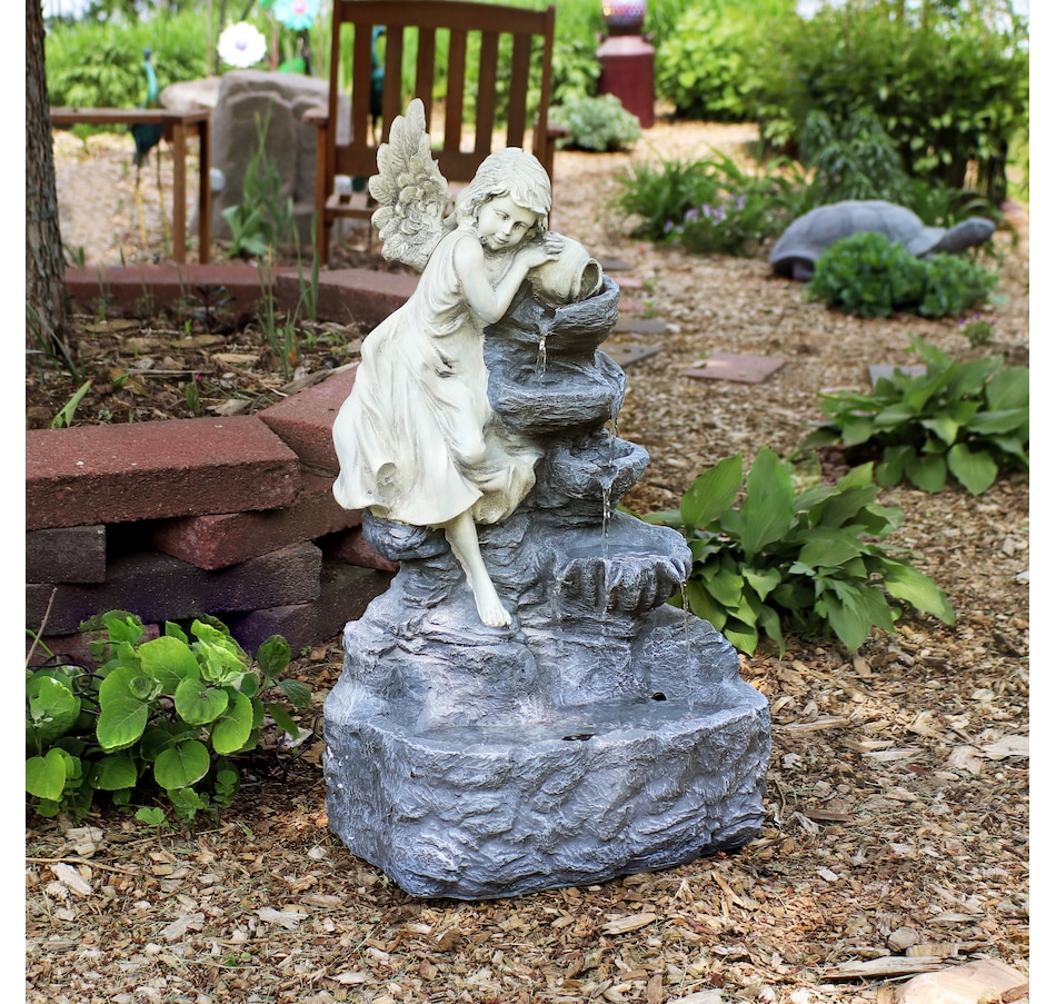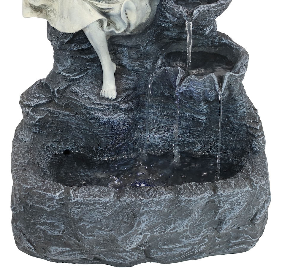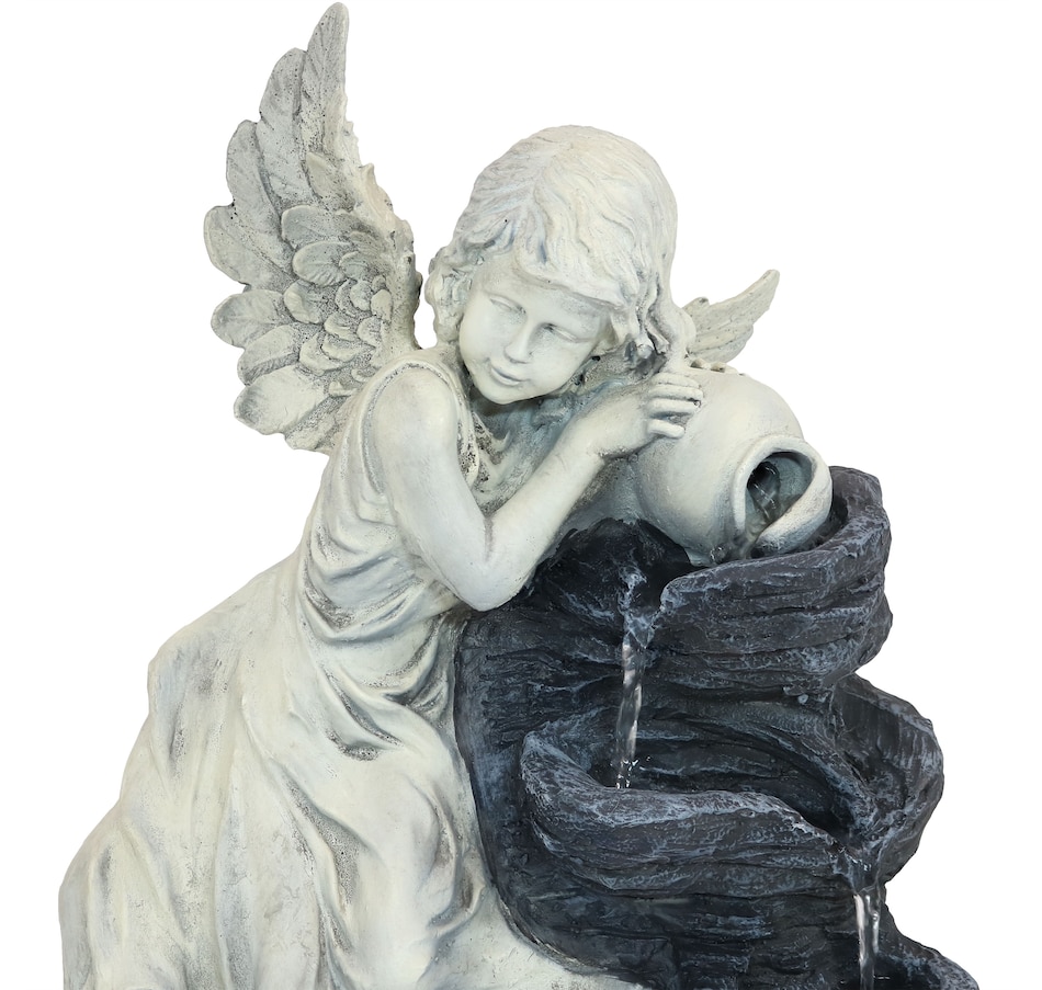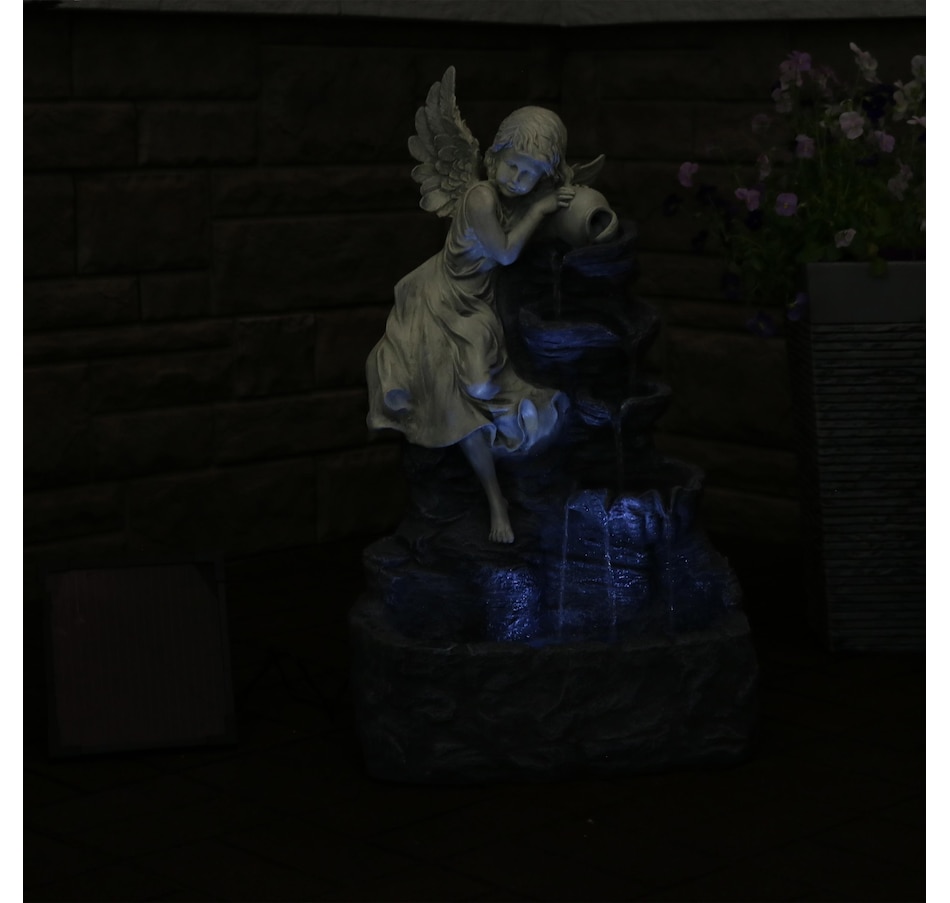 Add an inspiring water feature to any landscaping, garden, patio, backyard, front porch, or other outdoor area with this Angel Falls solar-powered water fountain. This fountain features a statuesque angel with a vase standing atop a rocky waterfall stream that features six waterfalls throughout the 5 tiers. Constructed from durable and easy-to-maintain polyresin, this fountain is lightweight enough to move around easily while remaining durable and resistant to the elements outdoors. With the solar panel, this fountain relies on solar energy for power. When the solar panel is in direct sunlight, the pump will be powered by solar energy and the battery pack will recharge. Once fully charged, the battery will power the fountain for up to 4 hours. The battery will also automatically run the fountain when it is cloudy or nighttime. Place this stunning, detailed fountain anywhere and watch any space illuminate with soothing sounds and beautiful views.