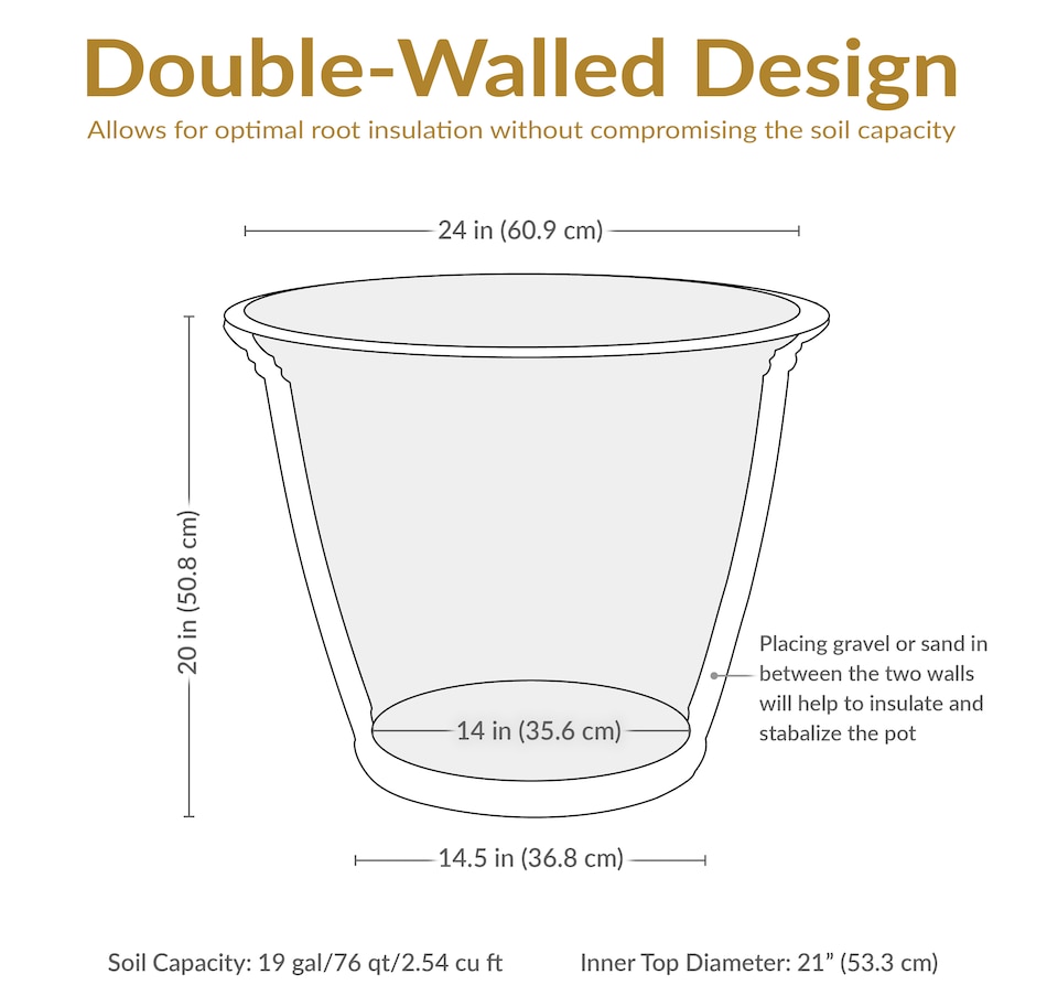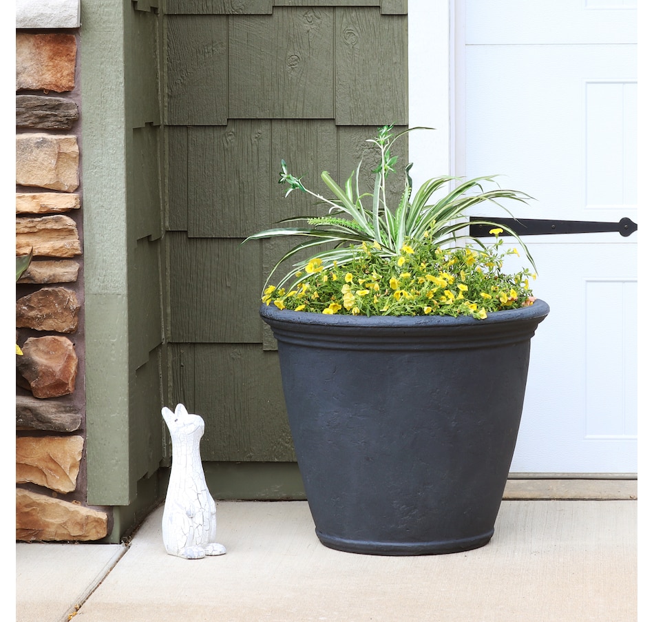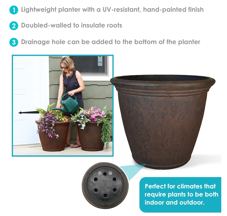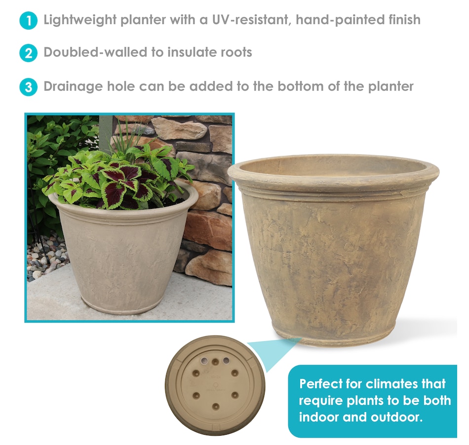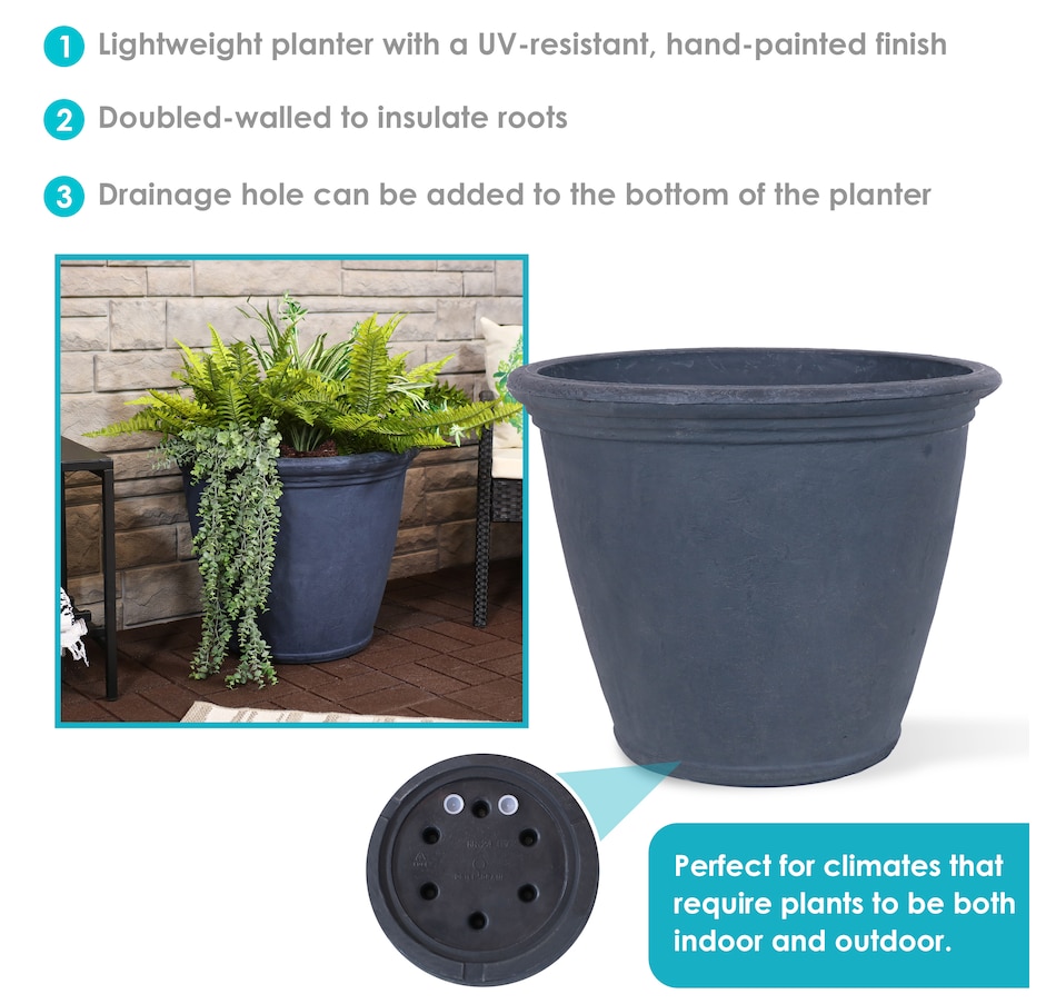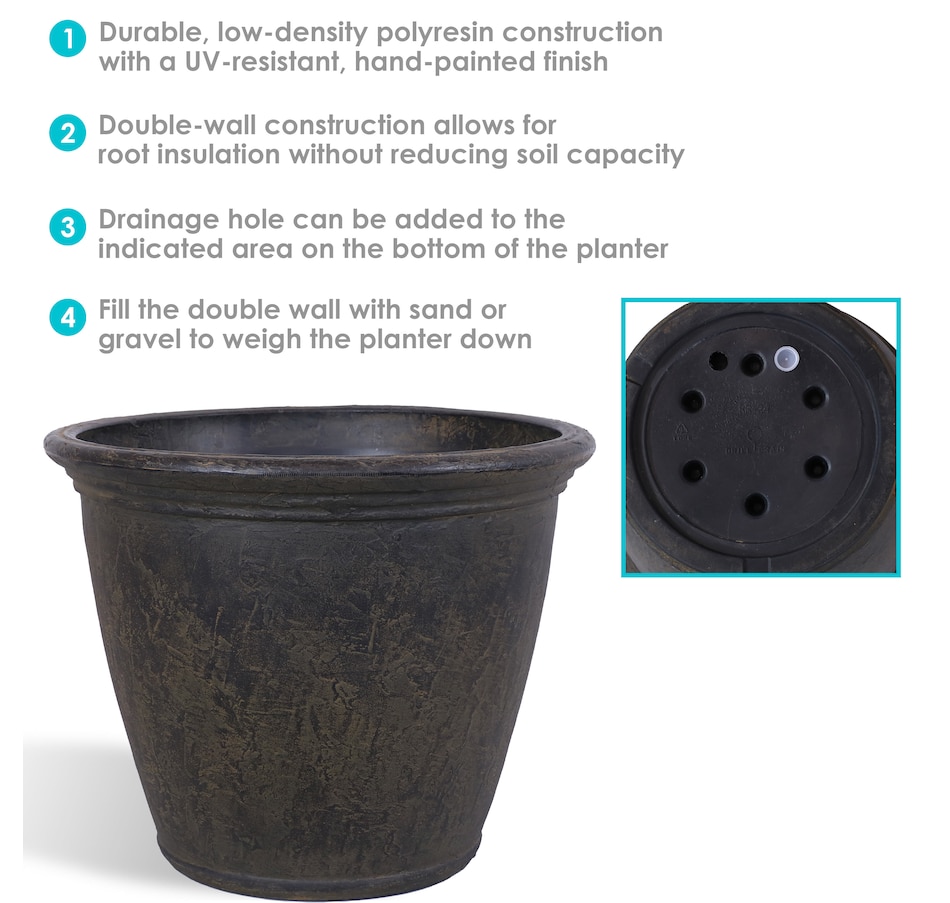 Add classic style and elegance to flowers, herbs, and other plants with the 24" Anjelica planter. Use the decorative planter in any indoor space or outdoors on the patio, deck, porch, garden, or yard. The large garden pot features a sleek, rolled rim for a contemporary and decorative touch. It is designed for all weather conditions due to its linear, low-density polyethylene (polyresin) construction and UV-resistant, hand-painted finish. The double-wall design with full-depth inner wall allows for optimal root insulation without compromising the soil capacity. The planter's outer wall can be filled with gravel or sand to weigh it down to withstand windy conditions. A drainage hole can be added to the area indicated on the bottom of the planter. Drill with a 1/4" bit through both walls for proper drainage. If using the planter indoors, be sure to use a protective saucer to protect floors from spills and water damage.
