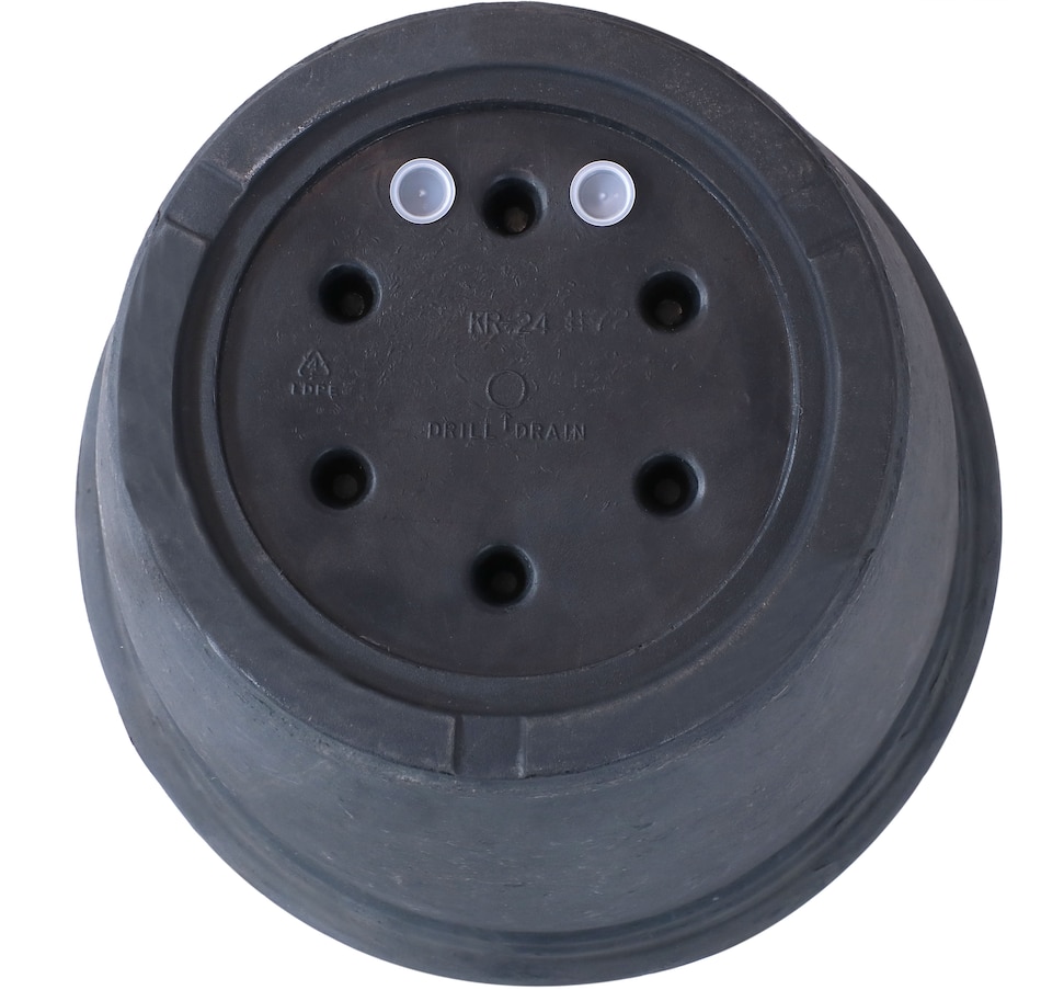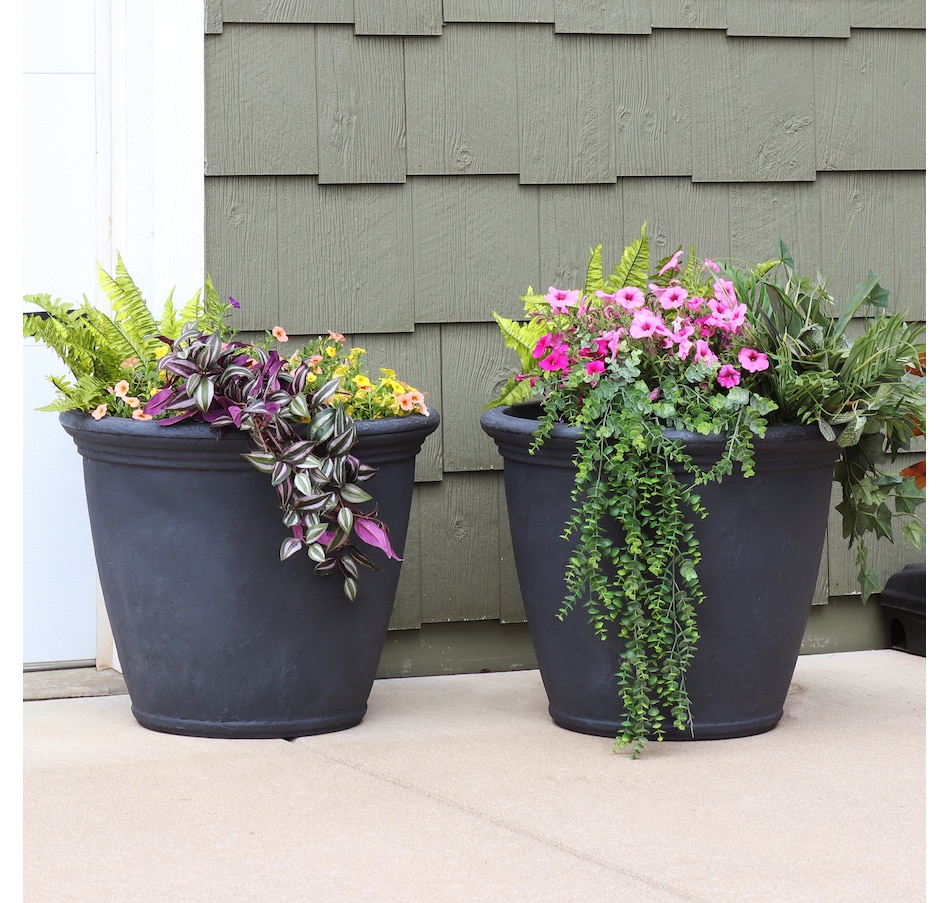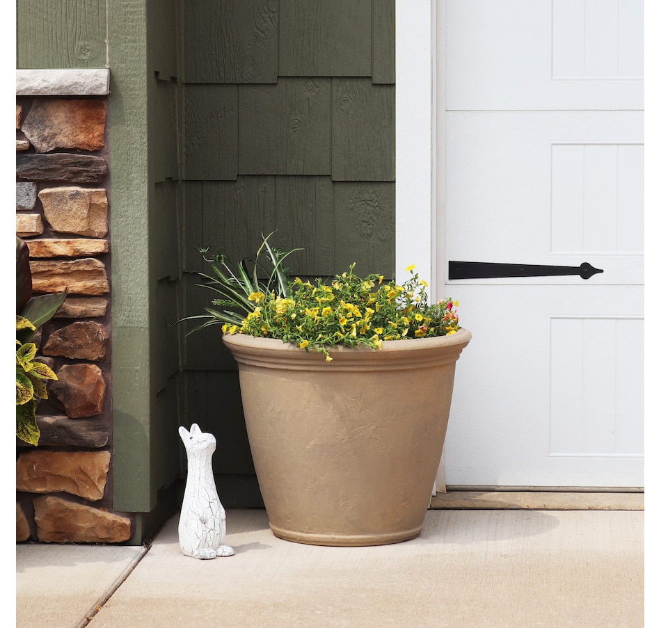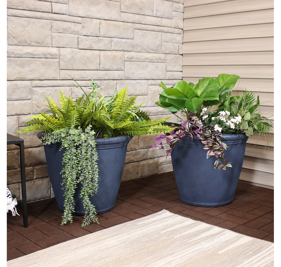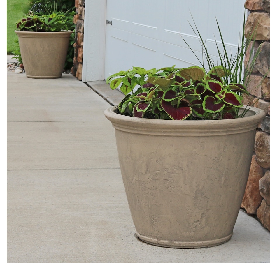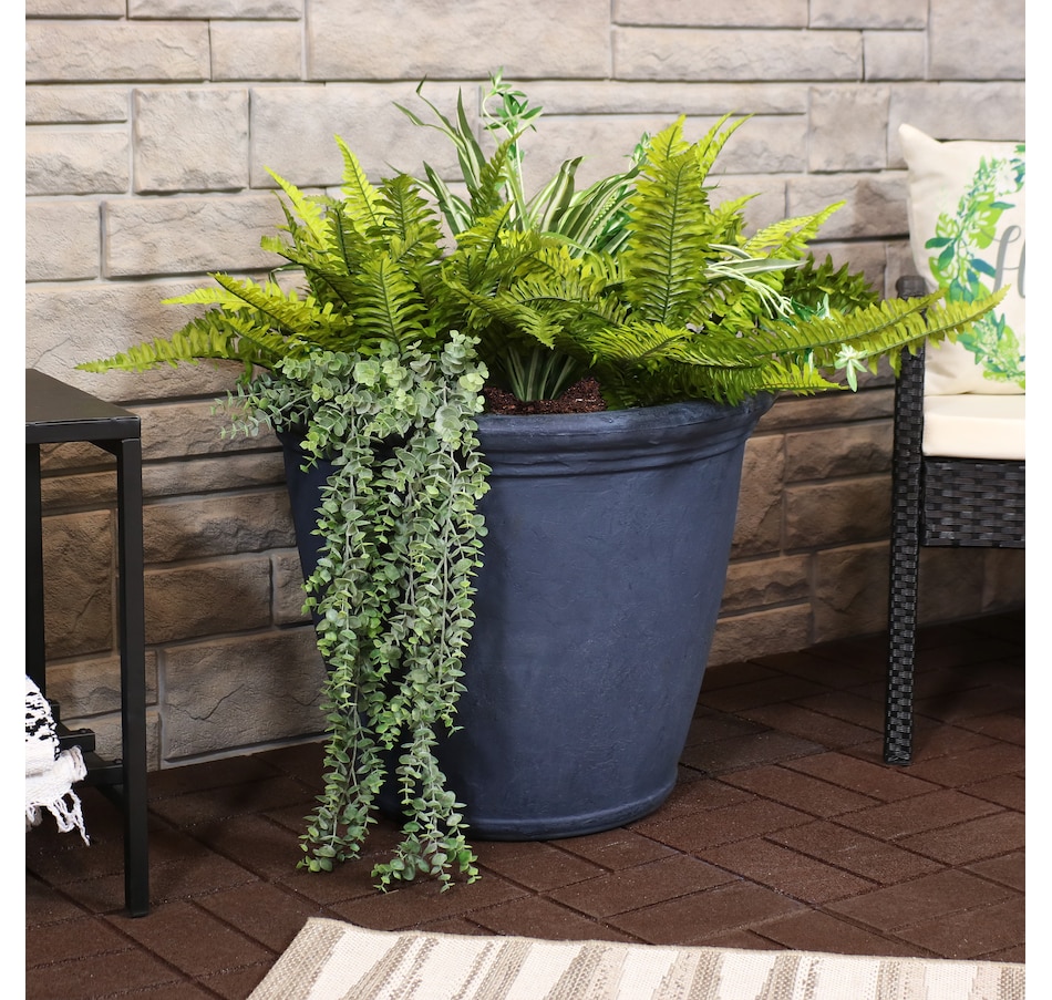 Add classic style and elegance to flowers, herbs, and other plants with the 24" Anjelica planter. Use the decorative planter in any indoor space or outdoors on the patio, deck, porch, garden, or yard. The large garden pot features a sleek, rolled rim for a contemporary and decorative touch. It is designed for all weather conditions due to its linear, low-density polyethylene (polyresin) construction and UV-resistant, hand-painted finish. The double-wall design with full-depth inner wall allows for optimal root insulation without compromising the soil capacity. The planter's outer wall can be filled with gravel or sand to weigh it down to withstand windy conditions. A drainage hole can be added to the area indicated on the bottom of the planter. Drill with a 1/4" bit through both walls for proper drainage. If using the planter indoors, be sure to use a protective saucer to protect floors from spills and water damage.