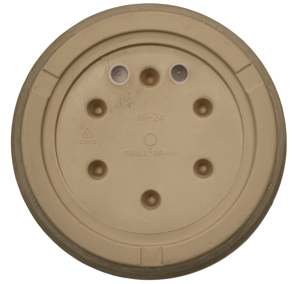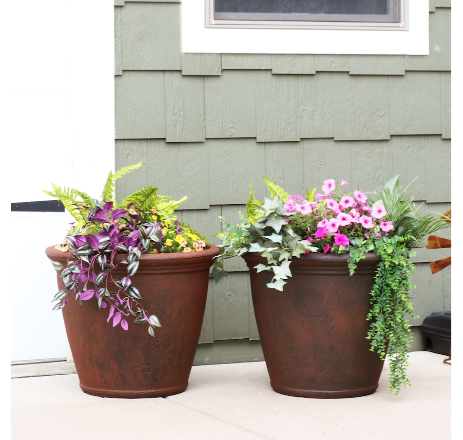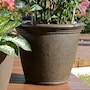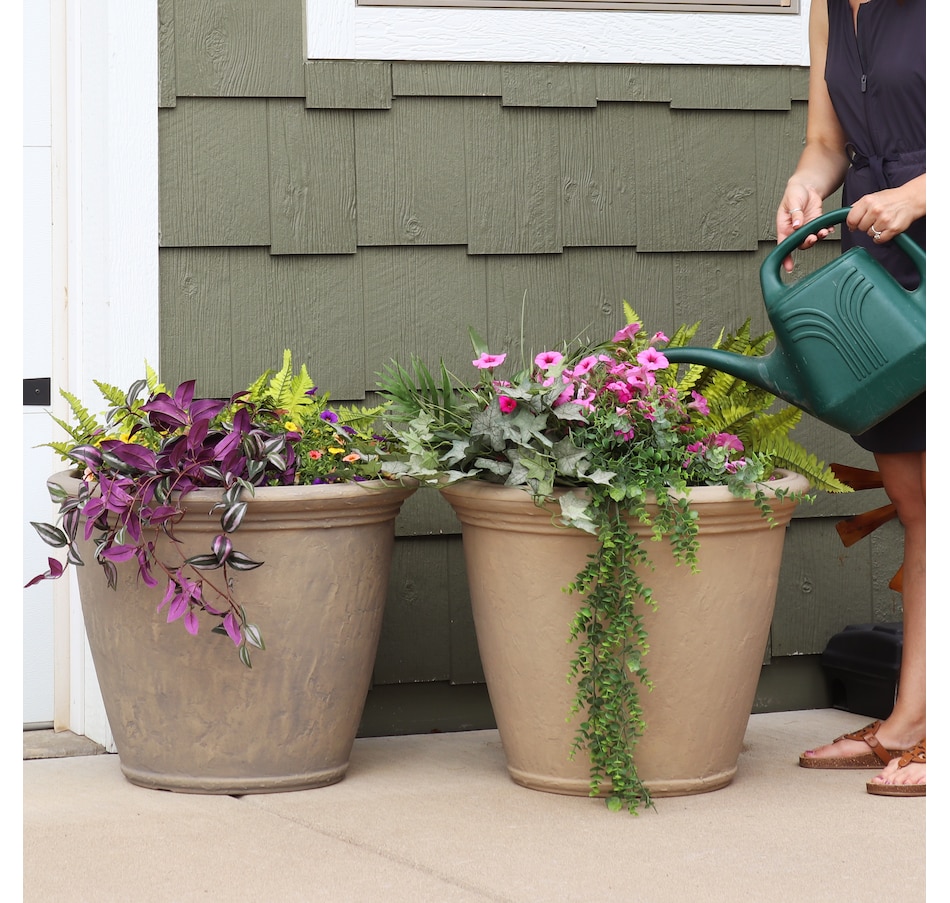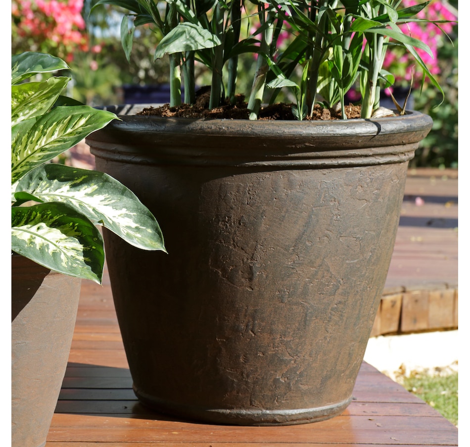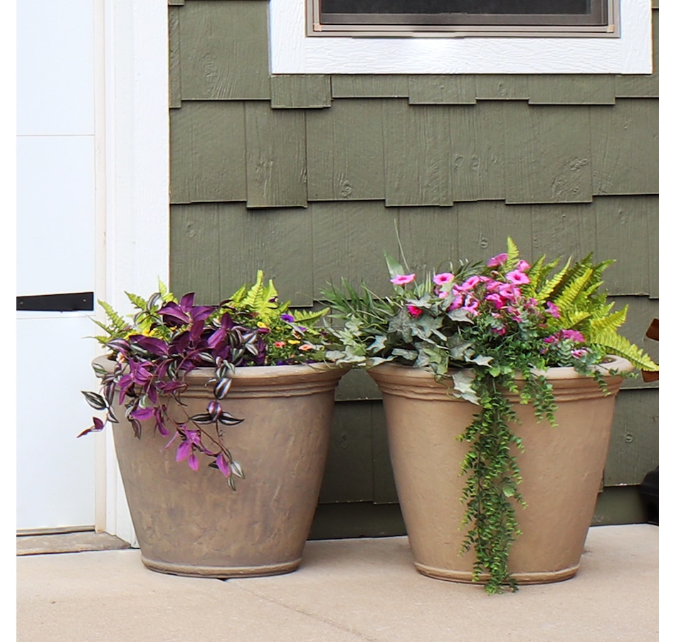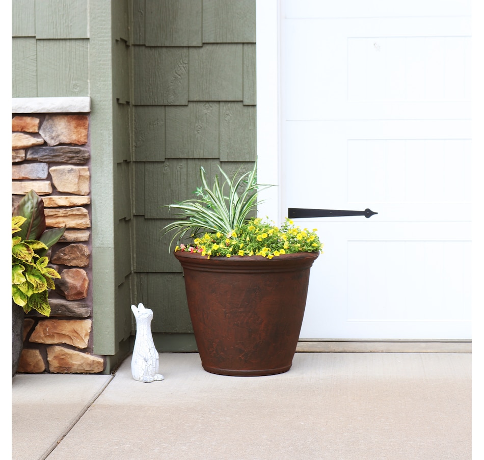 Add classic style and elegance to flowers, herbs, and other plants with the 24" Anjelica planter. Use the decorative planter in any indoor space or outdoors on the patio, deck, porch, garden, or yard. The large garden pot features a sleek, rolled rim for a contemporary and decorative touch. It is designed for all weather conditions due to its linear, low-density polyethylene (polyresin) construction and UV-resistant, hand-painted finish. The double-wall design with full-depth inner wall allows for optimal root insulation without compromising the soil capacity. The planter's outer wall can be filled with gravel or sand to weigh it down to withstand windy conditions. A drainage hole can be added to the area indicated on the bottom of the planter. Drill with a 1/4" bit through both walls for proper drainage. If using the planter indoors, be sure to use a protective saucer to protect floors from spills and water damage.