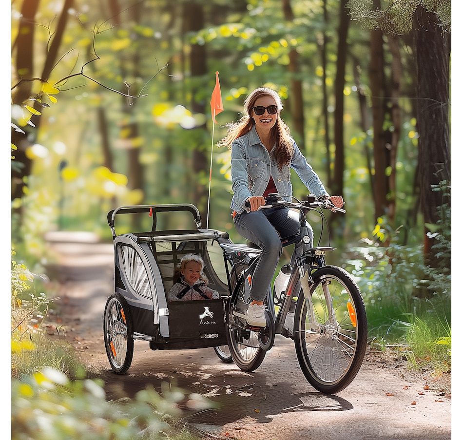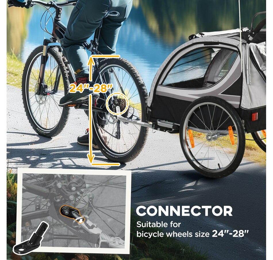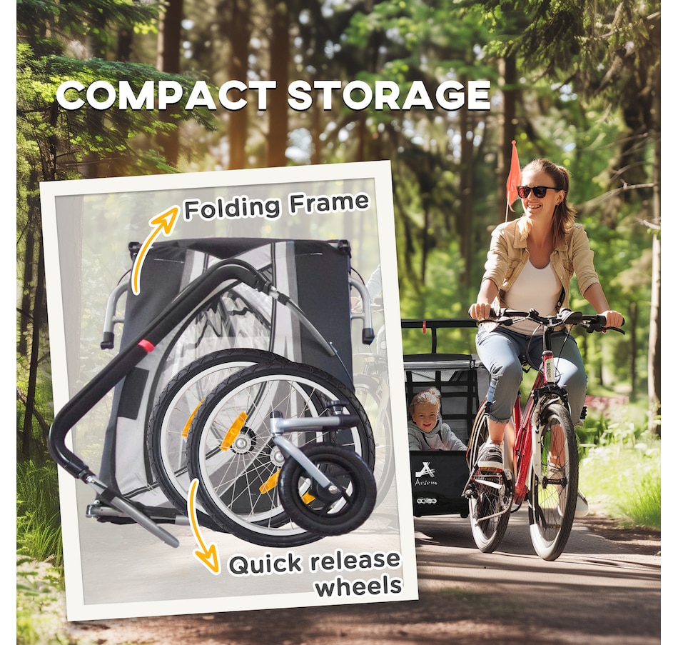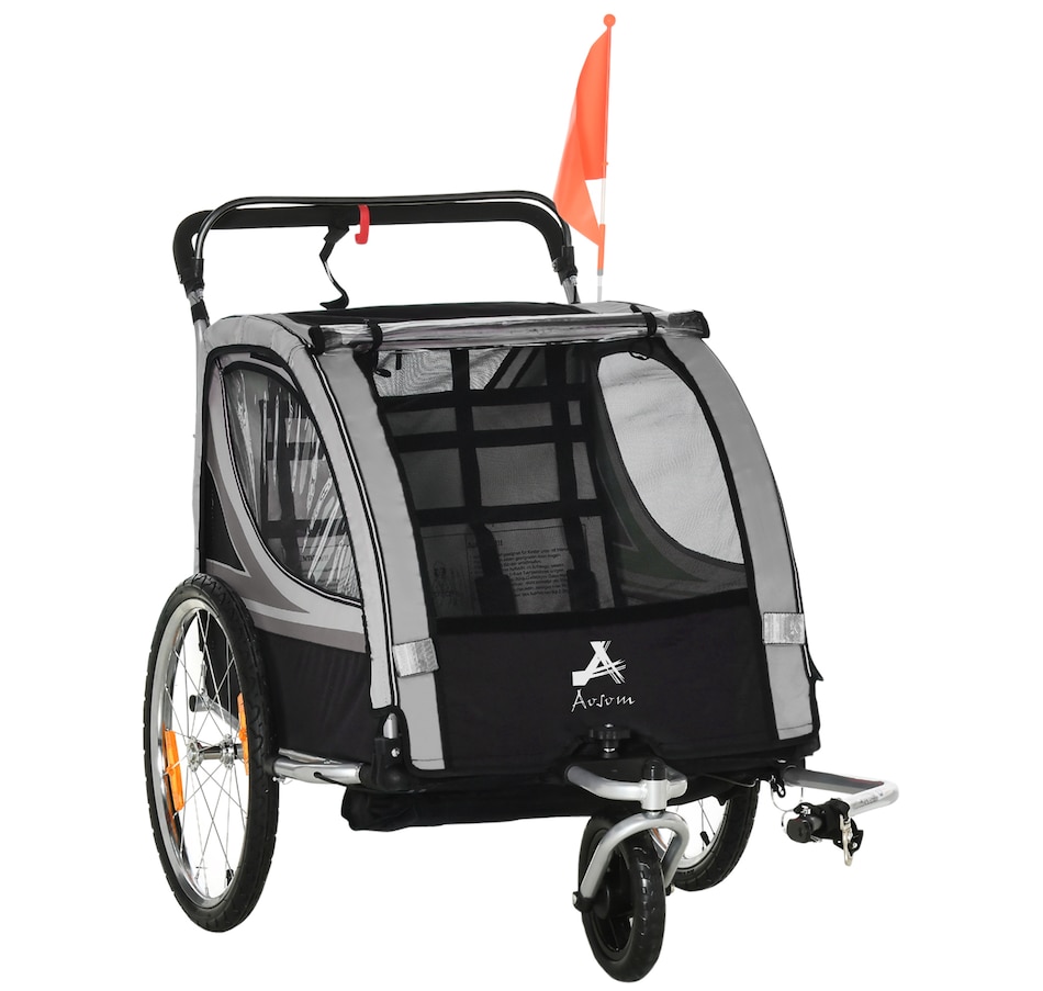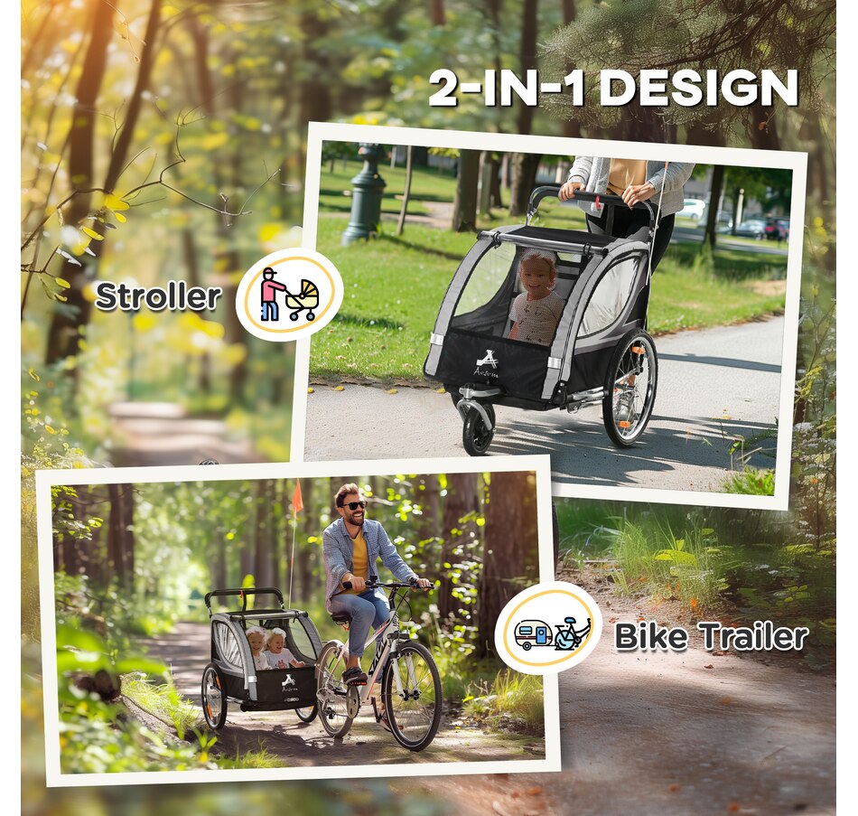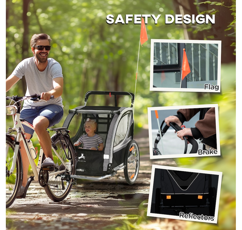 Experience the adventure with our 2-in-1 bike trailer stroller from Aosom! It's not just a trailer – it's a double stroller, offering dual functionality that keeps pace with your active lifestyle. Imagine the joy as your two kids enjoy the ride together, safely secured with a 5-point safety belt and reassured by the handbrake. Safety isn't just a word – it's a commitment, evident in the included flag and reflectors. With a design that's as robust as it is cosy, get ready for endless family fun!