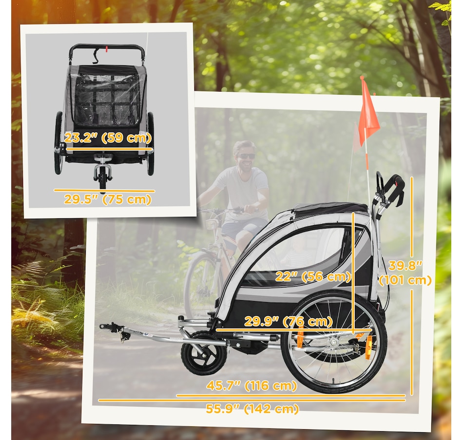 ● Overall Dimension: 55.9" L x 29.5" W x 39.8" H (142 x 75 x 101 cm) (Trailer), 45.7" L x 29.5" W x 39.8" H (116 x 75 x 101 cm) (Stroller);