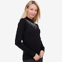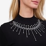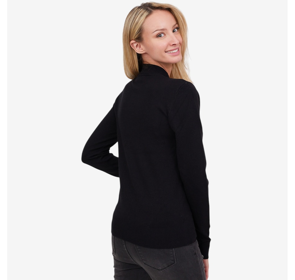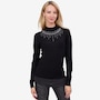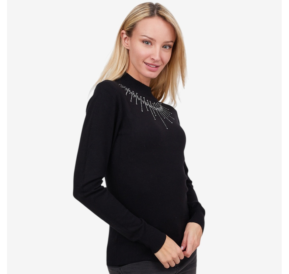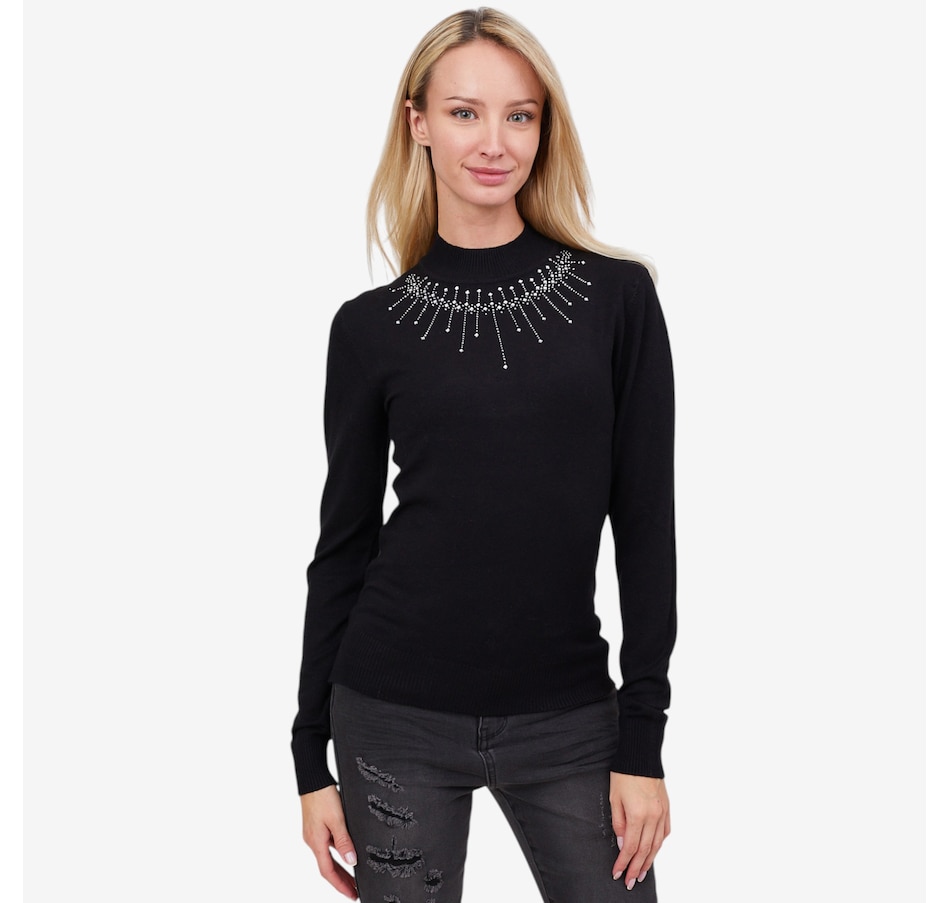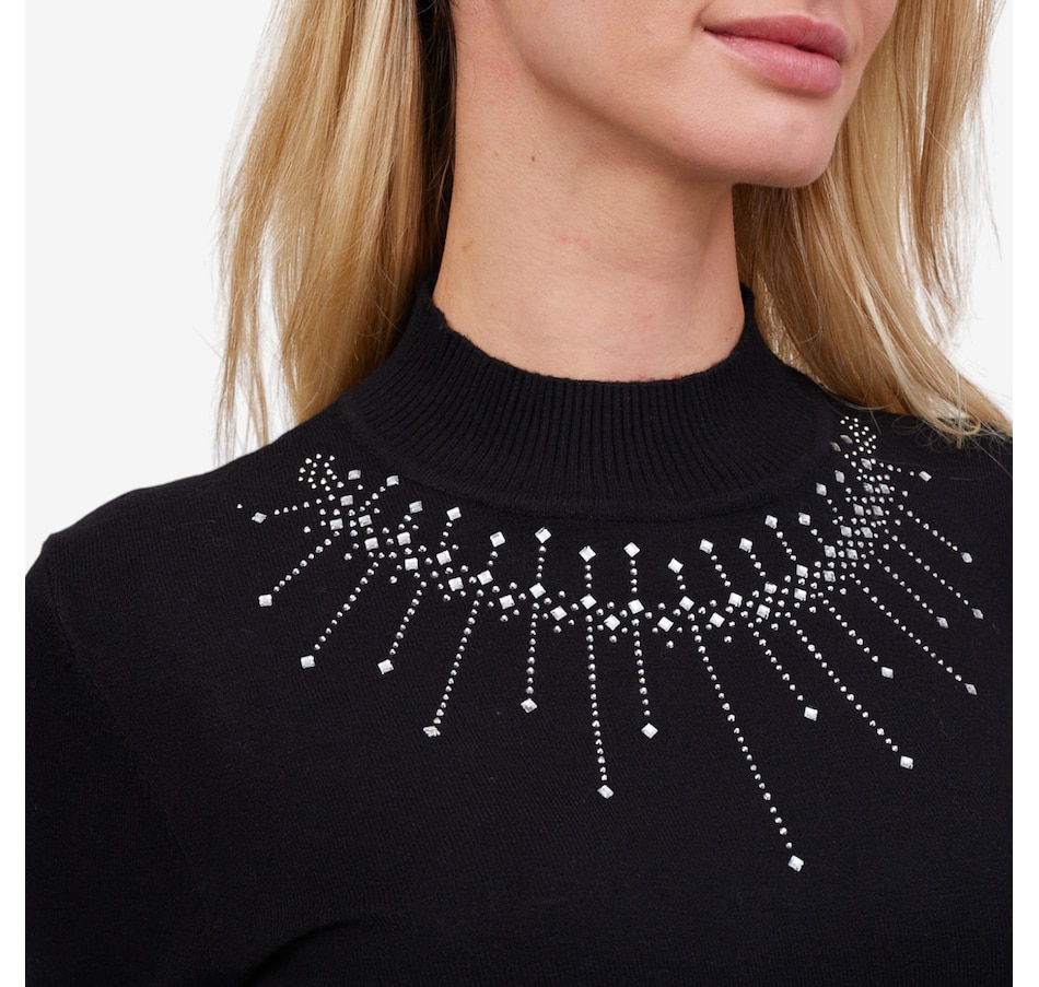 In a super-soft, ribbed knit, this chic jumper boasts striking gem and rhinestone embellishment at the neckline. It's finished with a mock neck and long sleeves. Tuck yours into a pencil skirt and style with leather boots to complete the look.