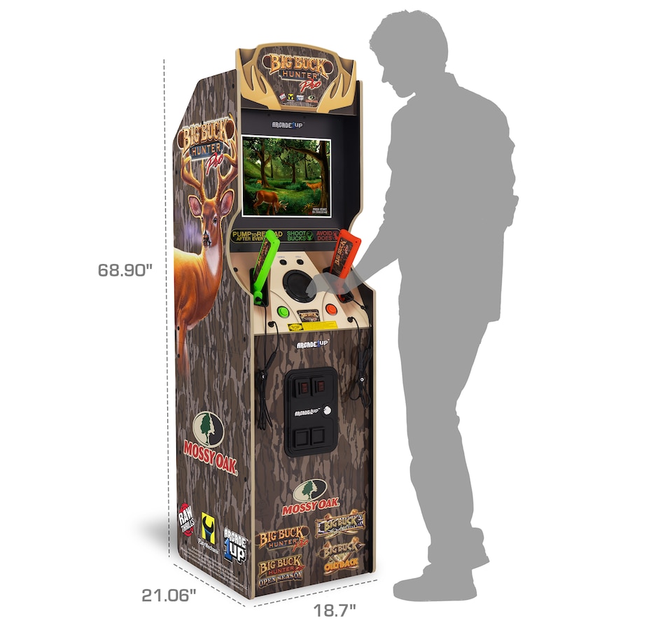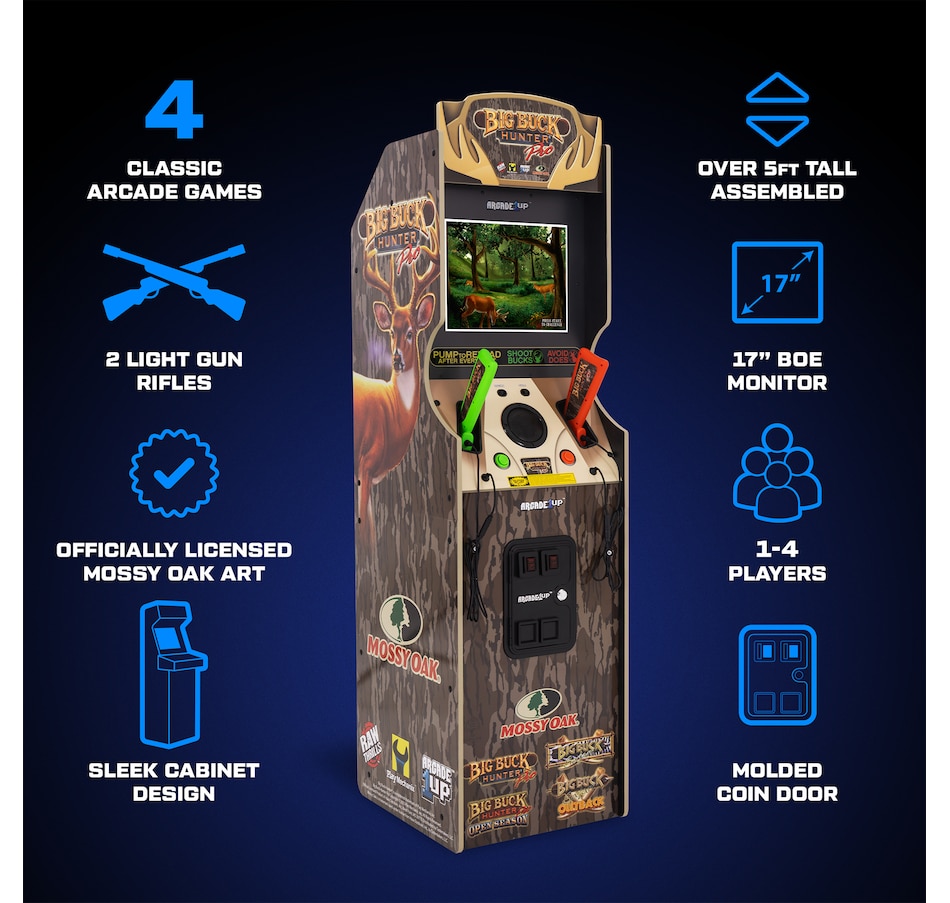 The hunt gets wilder with the Big Buck Hunter Mossy Oak Deluxe Arcade Machine from Arcade1Up! Get ready to bring the thrill of the wild into your home with this home arcade machine that redefines classic gaming. In an exciting collaboration with Mossy Oak, this deluxe edition combines the iconic outdoor brand with the timeless appeal of a retro arcade classic. Designed for hunting enthusiasts and gamers alike, this legacy video game is the ultimate addition to any arcade machine for home set-up.
