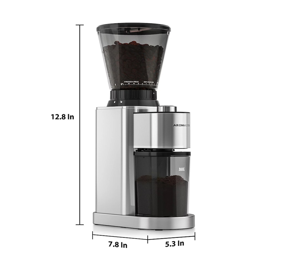 • Aromaster stainless steel burrs are ground evenly and slowly to reduce heat generation and avoid losing the original flavour of coffee