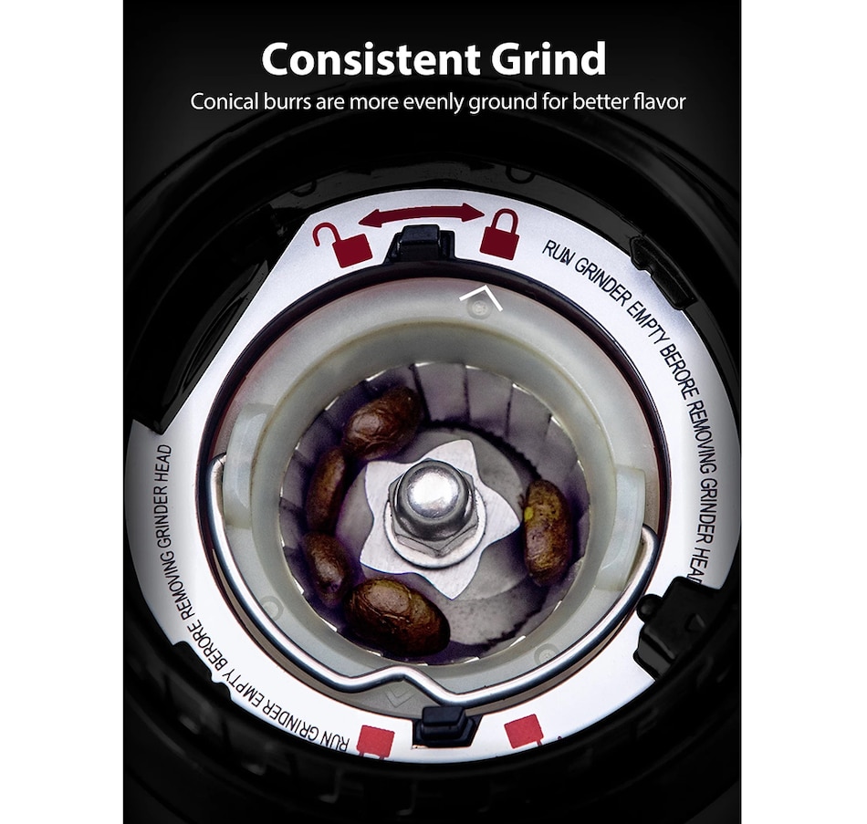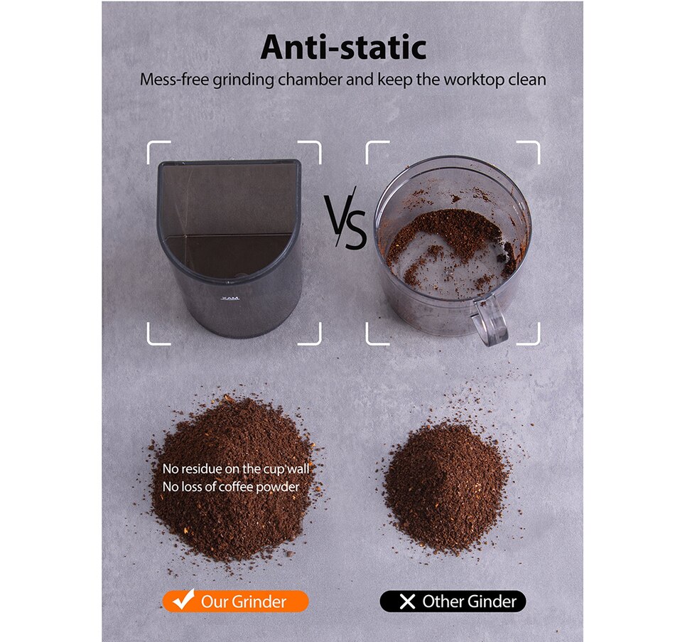 • Anti-static technology makes the coffee chamber mess-free, preventing coffee grounds from flying around and messing up the worktop