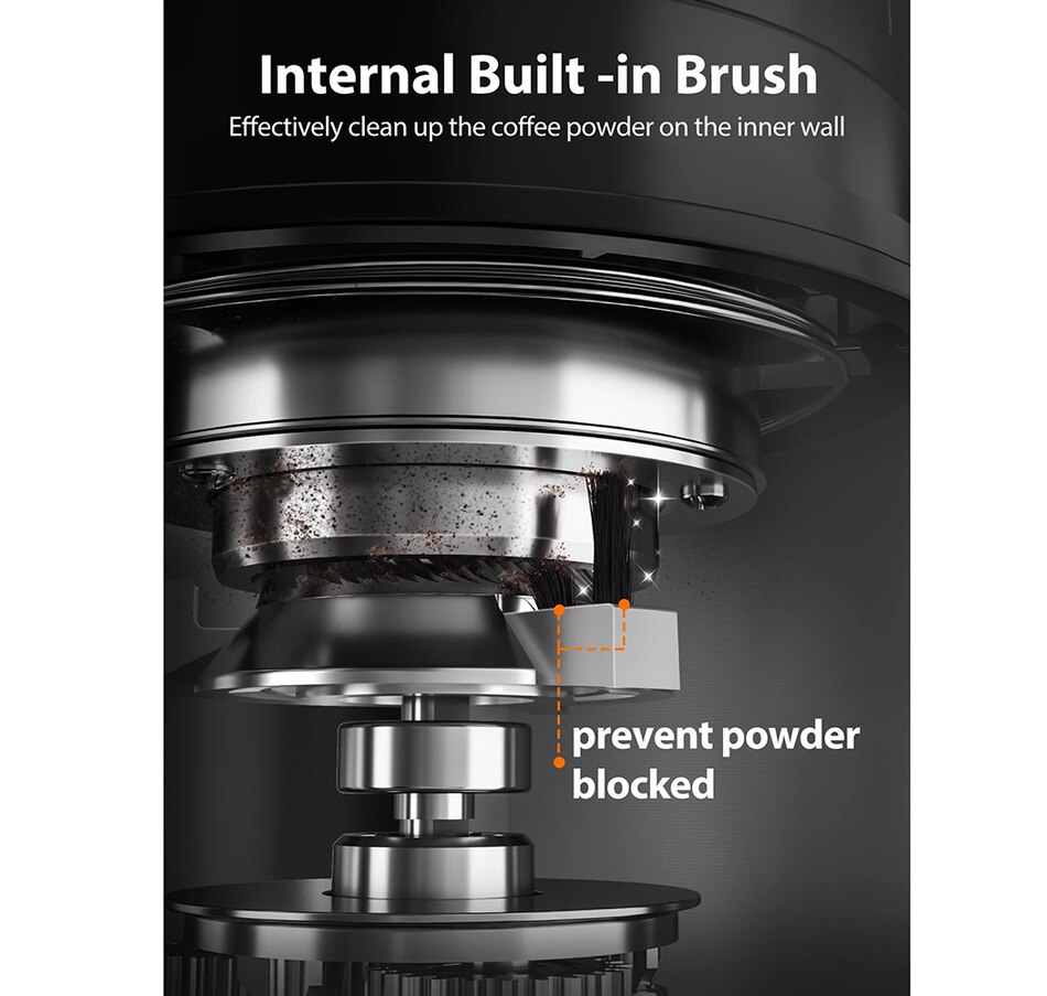 • Bean burr grinder is equipped with a built-in cleaning brush, which can effectively clean the internal powder to avoid powder blockage