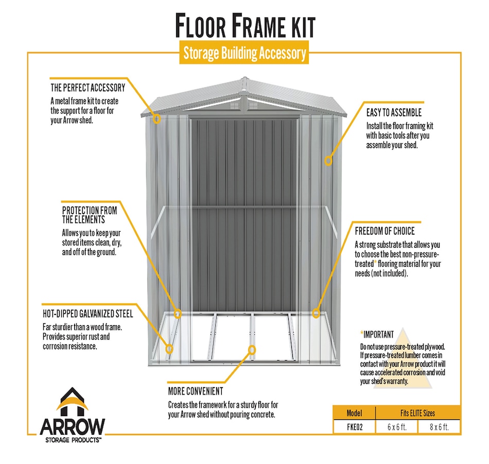 Arrow floor frame kits are the perfect accessory to your new shed. They provide the galvanized metal framework foundation to add a strong floor if your shed is placed on grass, gravel, or bare earth. The frame will raise the floor above ground level to help with drainage and help keep your items clean and dry. This includes metal framing parts only; attach plywood to complete your shed floor. Use 5/8” minimum thickness, exterior grade plywood that has a waterproof adhesive.