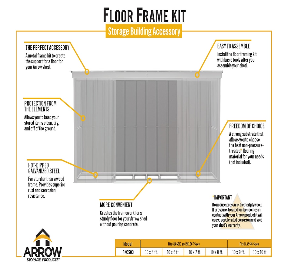 Arrow floor frame kits are the perfect accessory to your new shed. They provide the galvanized metal framework foundation to add a strong floor if your shed is placed on grass, gravel, or bare earth. The frame will raise the floor above ground level to help with drainage and help keep your items clean and dry. This includes metal framing parts only; attach plywood to complete your shed floor. Use 5/8” minimum thickness, exterior grade plywood that has a waterproof adhesive.