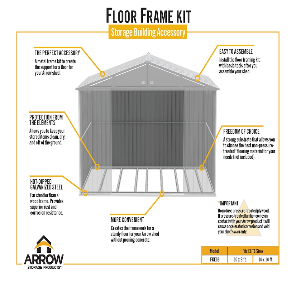Arrow floor frame kits are the perfect accessory to your new shed. They provide the galvanized metal framework foundation to add a strong floor if your shed is placed on grass, gravel, or bare earth. The frame will raise the floor above ground level to help with drainage and help keep your items clean and dry. This includes metal framing parts only; attach plywood to complete your shed floor. Use 5/8” minimum thickness, exterior grade plywood that has a waterproof adhesive.