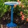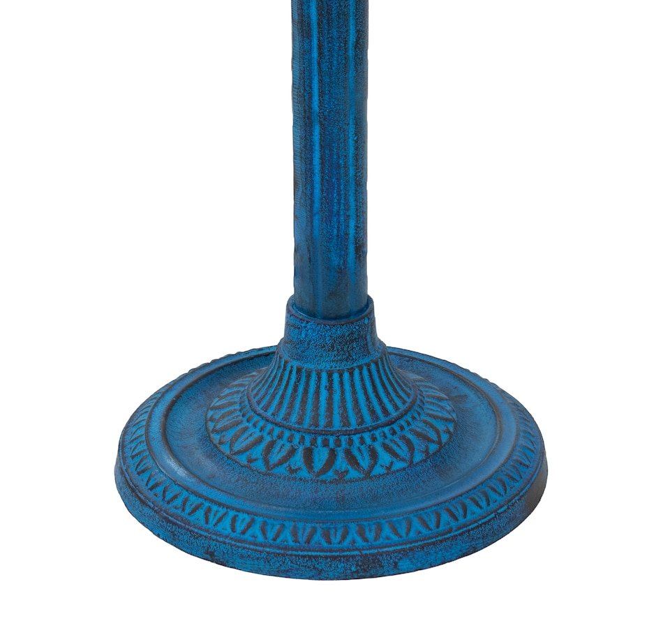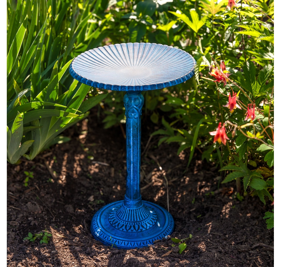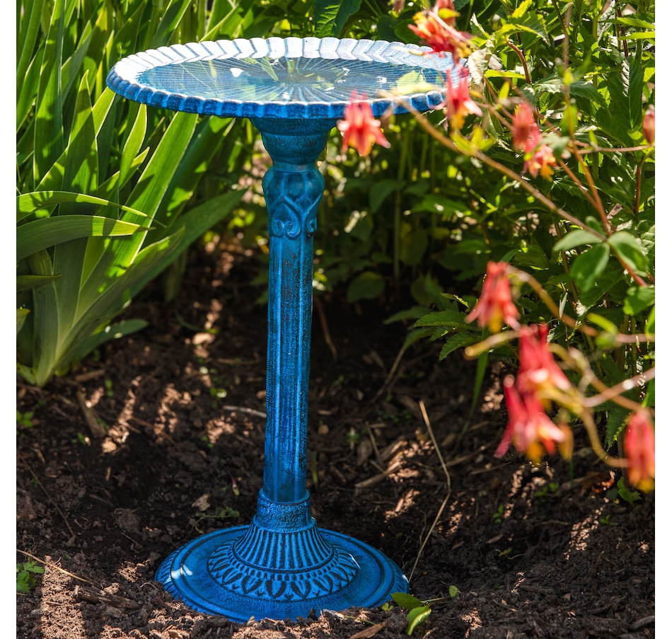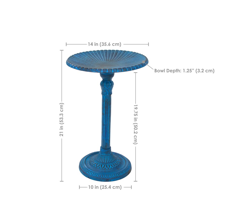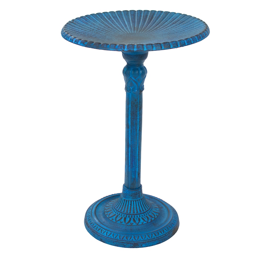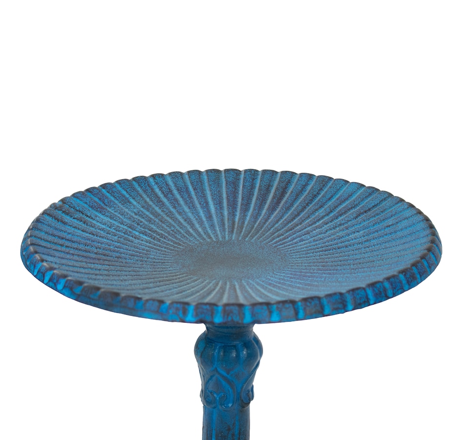 - Cast aluminum bird bath with blue patina finish
