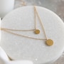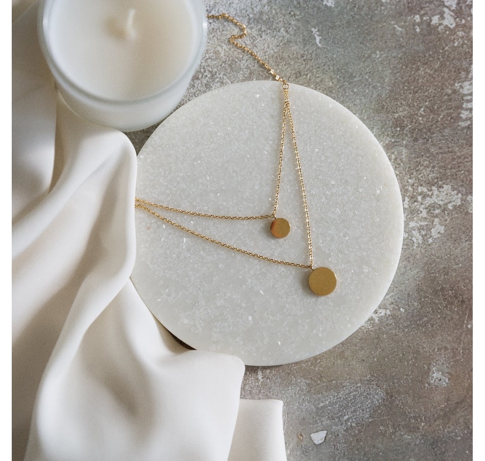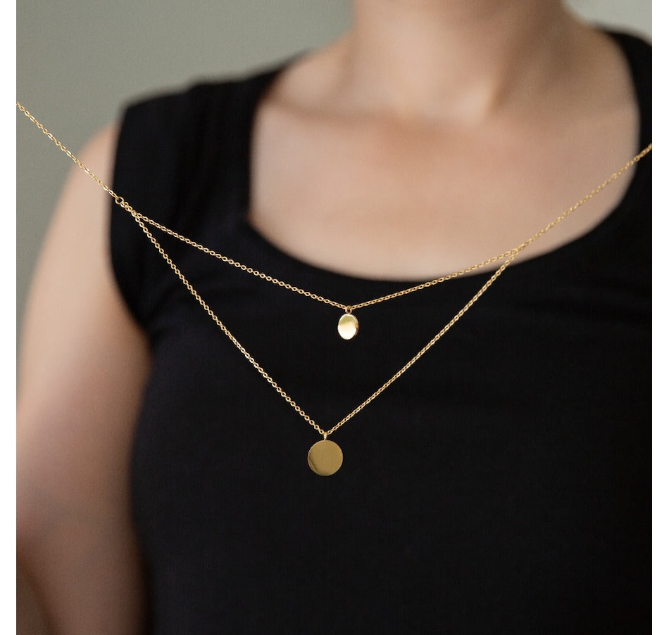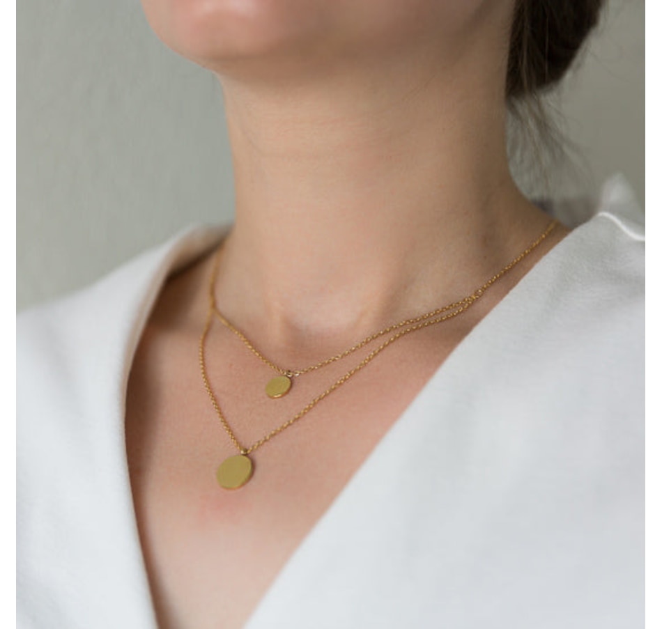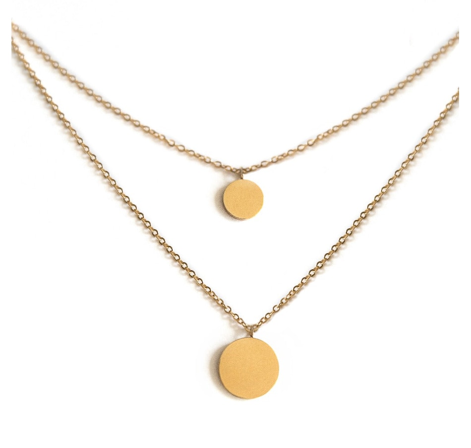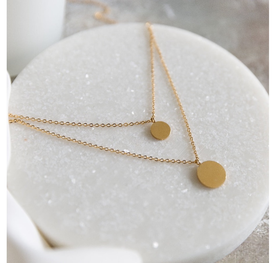 Part of the new jewelry collection from , this Layered Double Disc Necklace features two delicate chains layered and adorned with two gold plated discs of different sizes.  Product Details:SKU: J-2DISCNECKGLDMaterial: Stainless SteelColor: Gold PlatedClosure: Lobster ClaspOverall Length: 16.25 inches 2 inch extensionUpper Gold Plated Disc: .33 inches in diameterLower Gold Plated Disc: .5 inches in diameterPackaging: Gift BoxA portion of sales of the  Layered Double Disc Necklace for women goes to charitable causes. Be Good, Do Good! For more information on our charitable giving, please visit Gives.