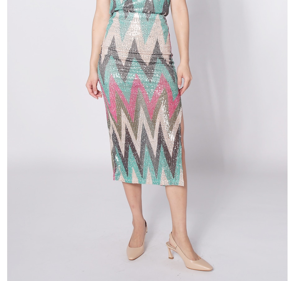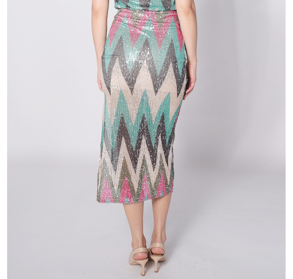 Elevate your look in defined style with the Grammy Zig Zag sequin midi skirt from Paper Label.