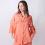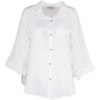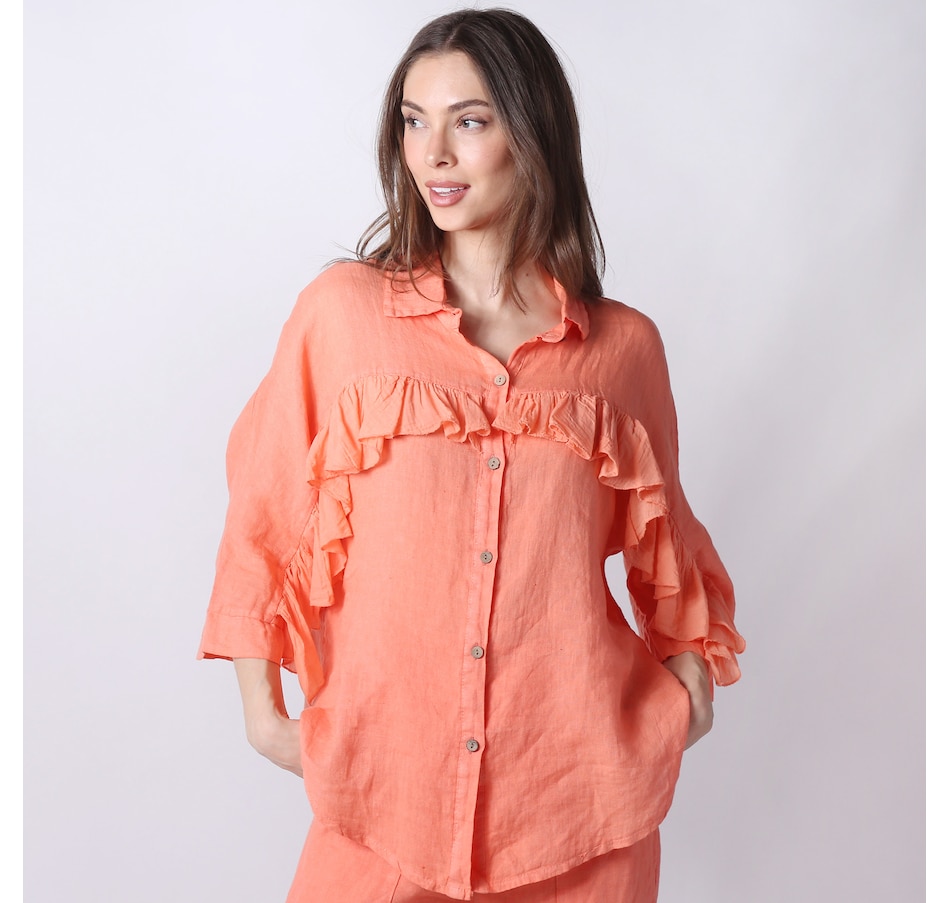 • Loose fit, 3/4 length sleeve, button closure, ruffled detail at front and collared style, straight hem