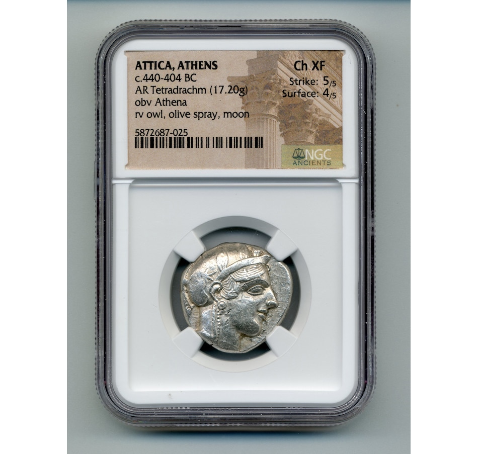 • Athenian Owl Silver Tetradrachm 440 to 404 BCE NGC Certified Choice Extra Fine