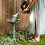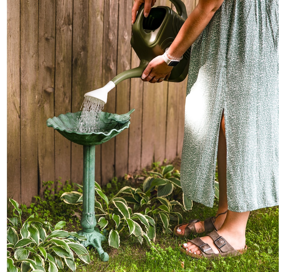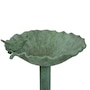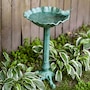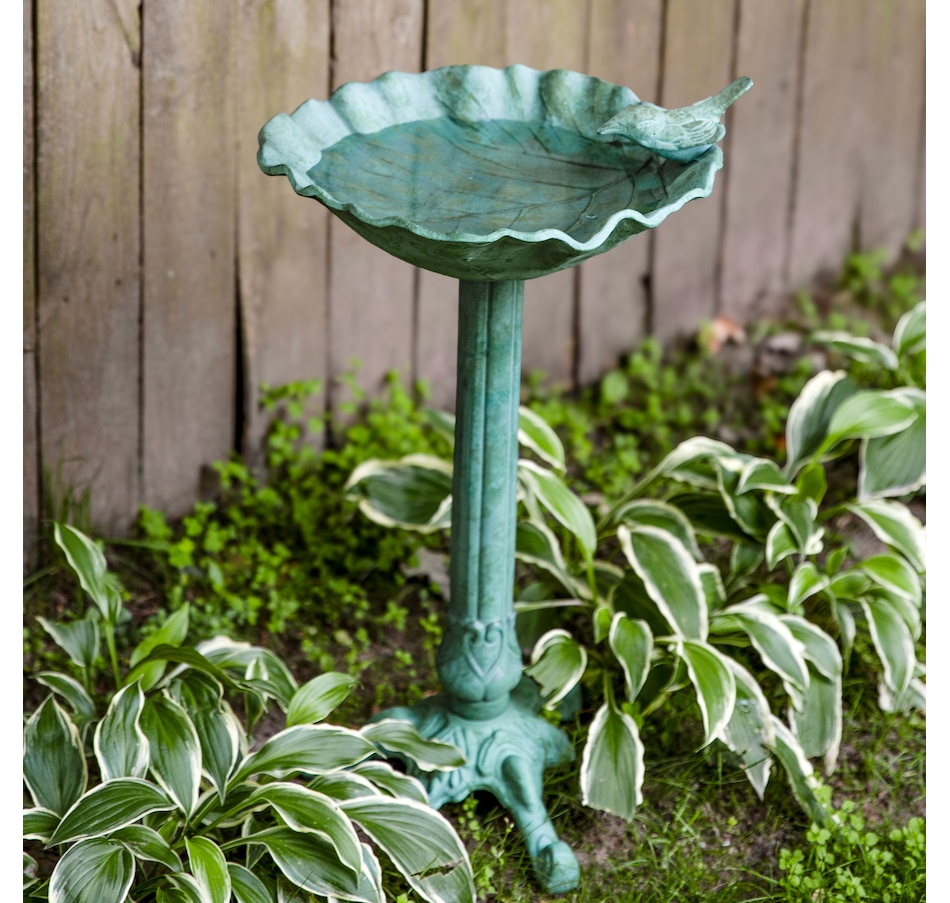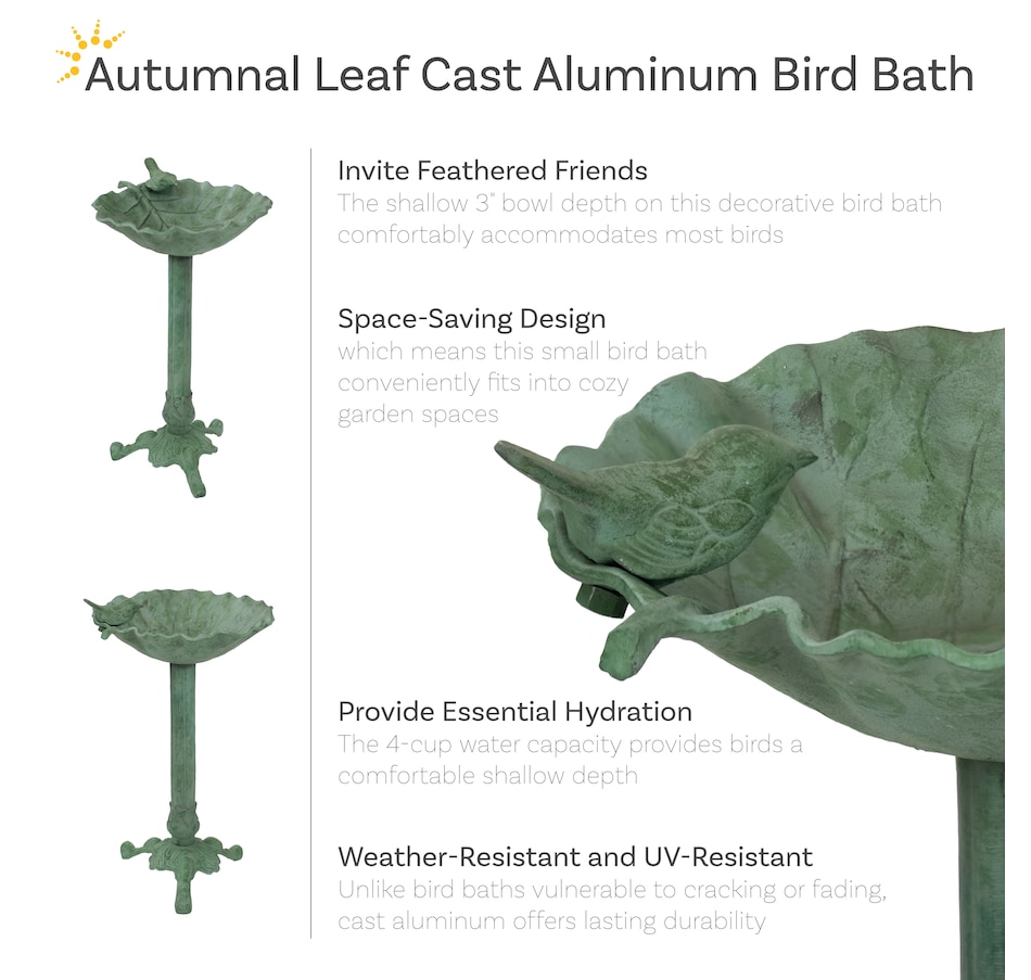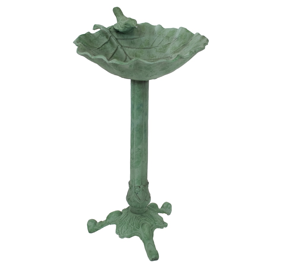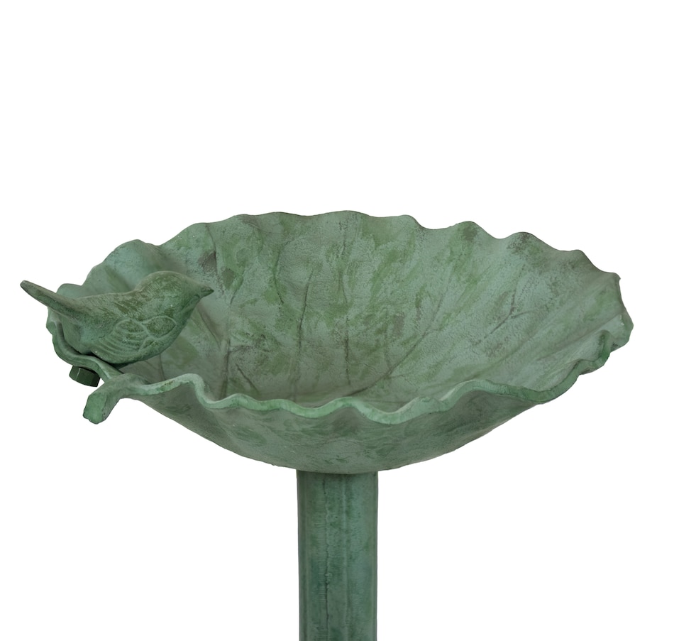 Invite feathered friends to a refreshing oasis with this cast aluminum bird bath. The weather-resistant and UV-resistant finish, boasting a captivating green patina, ensures this bird bath endures the elements for years to come, mimicking the natural beauty of aged copper. Unlike bird baths vulnerable to cracking or fading, cast aluminum offers lasting durability, guaranteeing it remains a stunning focal point in any garden. Nature's inspiration extends to the design itself. The bowl, crafted in the delicate shape of a leaf rests on a traditional base. This beautiful and natural aesthetic complements the surrounding greenery, creating a harmonious haven for birds. A delightful metal bird sculpture perches on the side, adding a whimsical touch and providing a familiar resting spot for incoming visitors. The shallow basin, mirroring the curve of a leaf, offers space for birds to bathe and preen comfortably. The sturdy cast aluminum construction on this metal freestanding bird bath ensures a stable platform, offering a reliable resting spot for feathered guests.