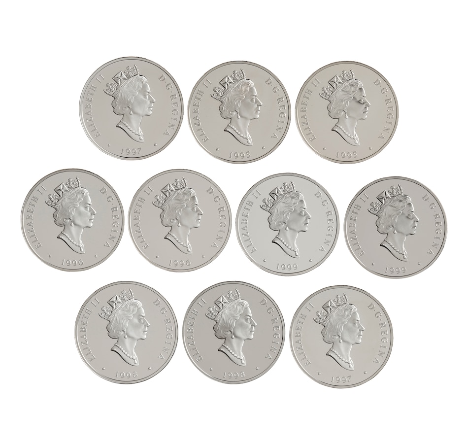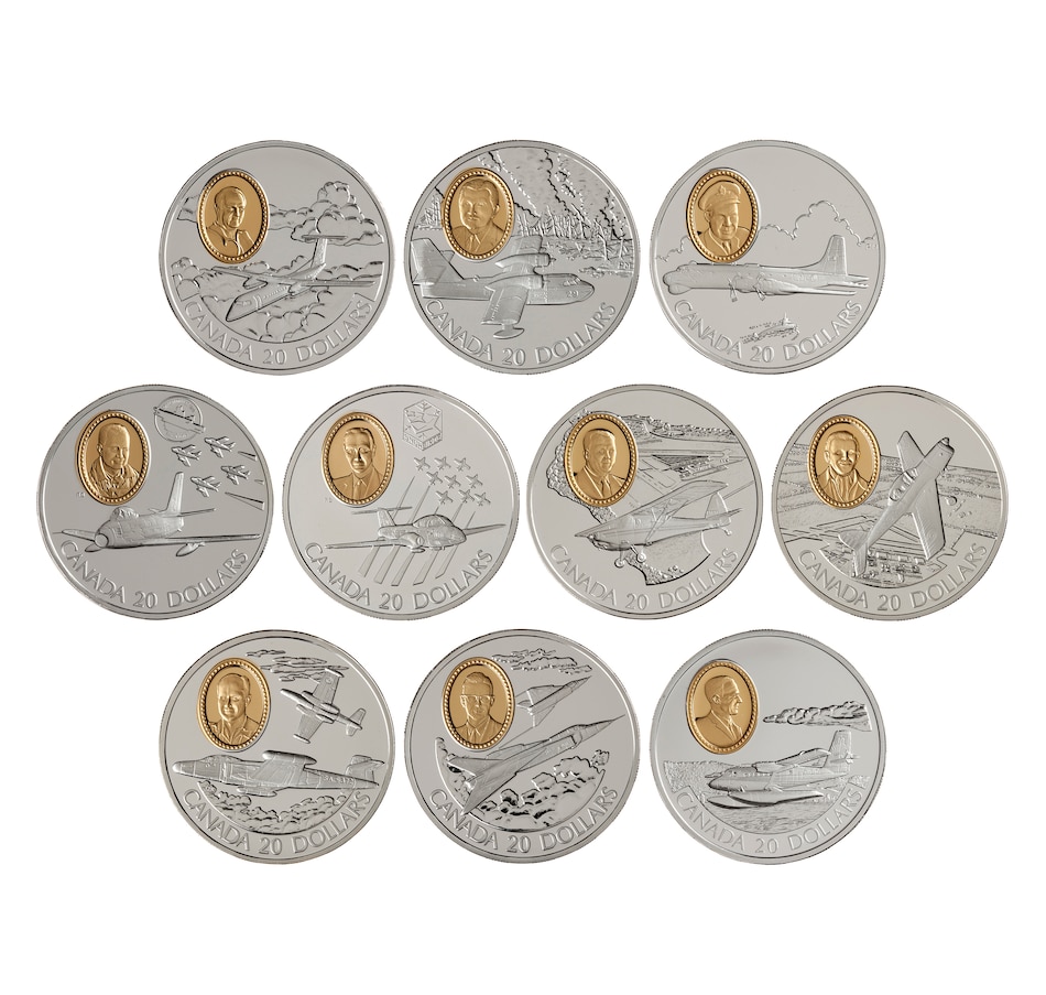 The Royal Canadian Mint has celebrated Canada's substantial aviation achievements and heroes with this collection of double-struck, frosted cameo proof silver coins that were issued from 1990 to 1998. The coins each weigh one full ounce, and are struck in .925 sterling silver with a 24kt yellow gold cameo overlay. These cameos feature portraits of individuals whose role in the design, operation, or execution of the respective aircraft was a key in our historical understanding and appreciation of it. Original mintages for the coins available in this offer range from 30,000 to 44,000.
