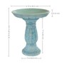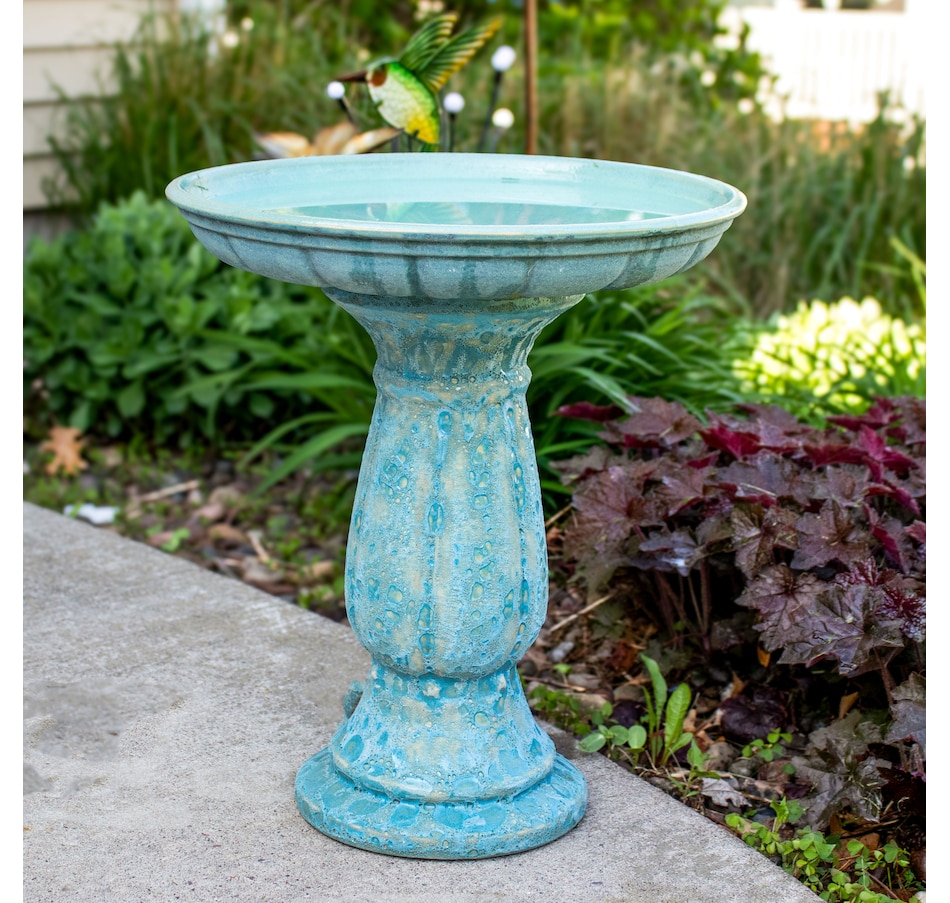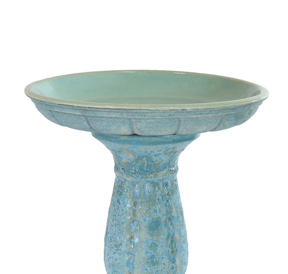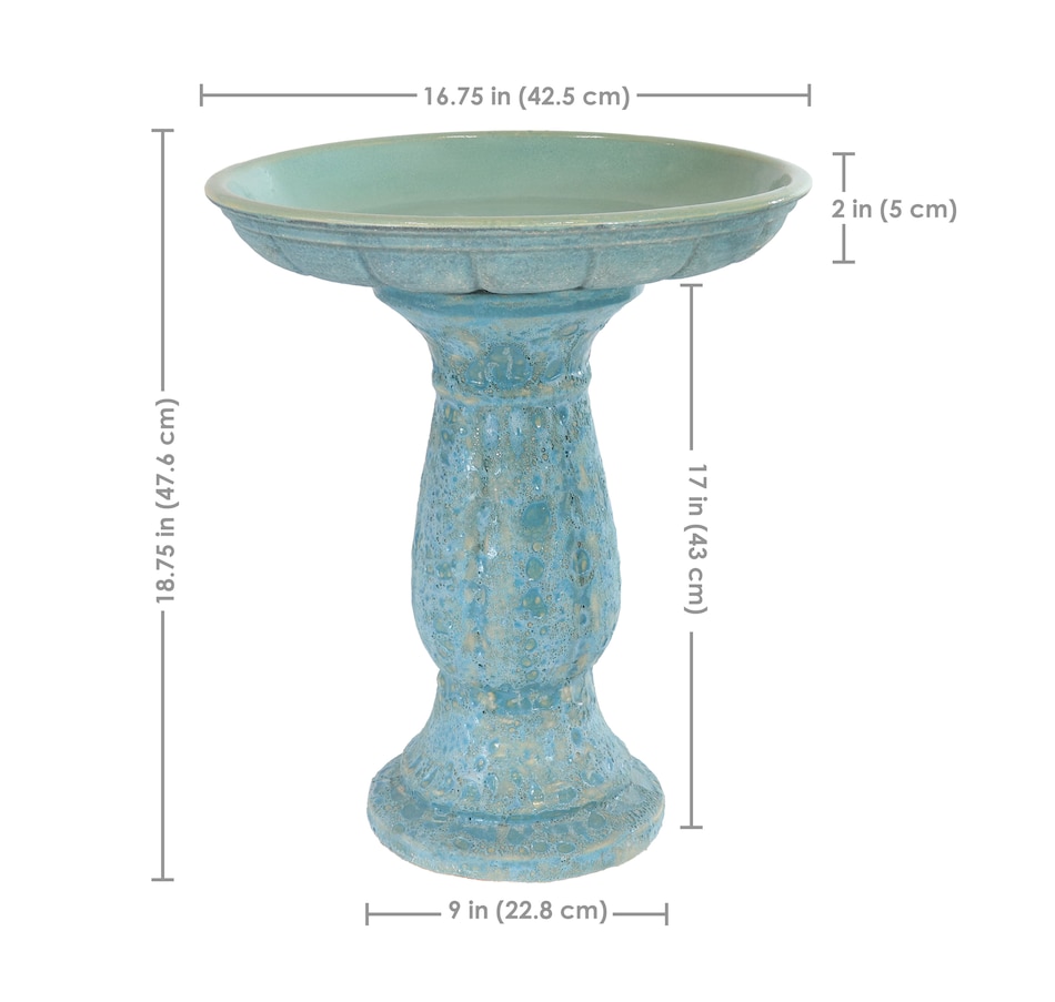 Add a dramatic centerpiece to the patio or garden with this striking outdoor bird bath. Made from frost- and UV-resistant ceramic to resist the outdoor elements, this small decorative bird bath features a shiny, glazed blue bowl and a unique, one-of-a-kind lava surface treatment for a distinct look. The bowl is capable of holding up to 10 cups so there is plenty of water for feathered friends to splash and preen. Assembling this bird bath is easy, simply place the bowl onto the pedestal. No tools or hardware are required for assembly. This elegant bird bath is a stylish addition to the garden, patio, or front porch. To attract more birds, try to place this bird bath in a slightly shaded area with nearby tree or bush shelter.