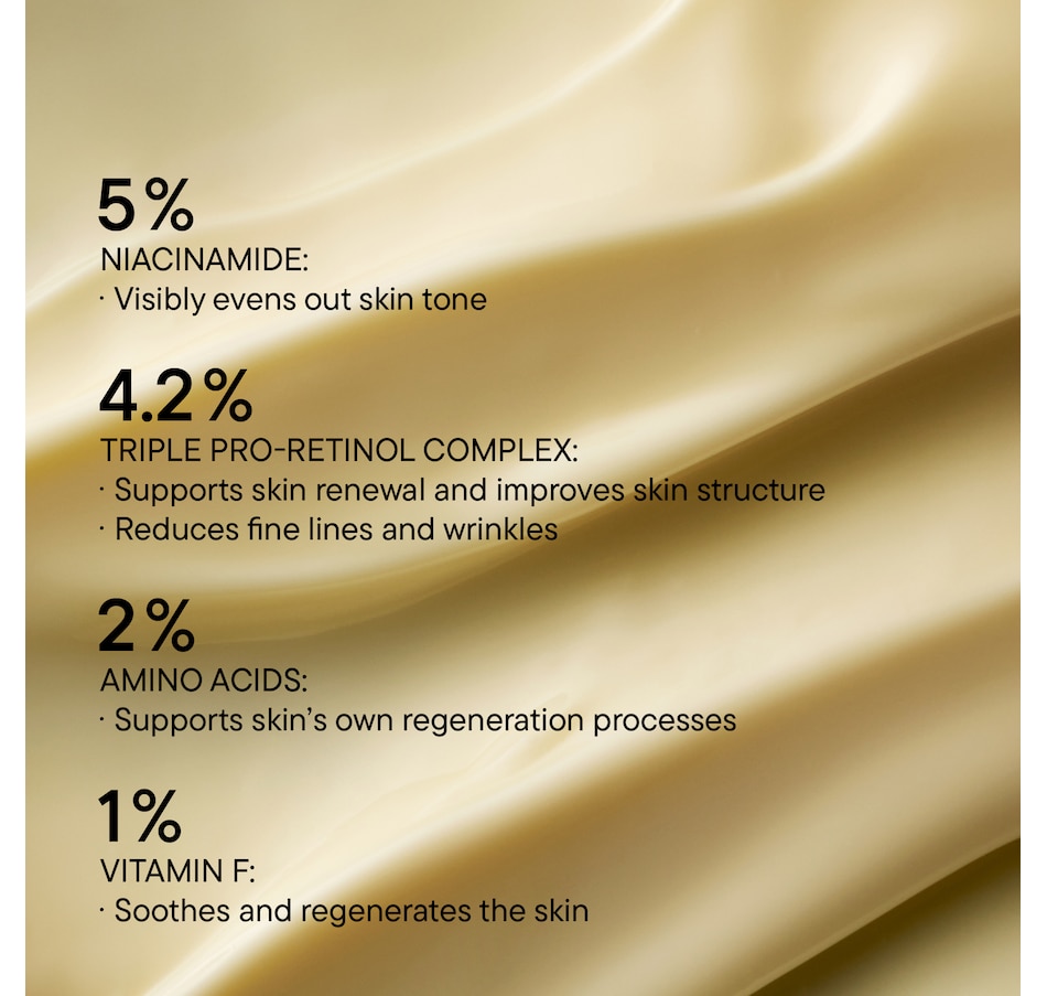 4.2% Triple Pro-Retinol complex, 5% niacinamide, 2% amino acids, 1% vitamin F