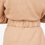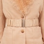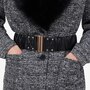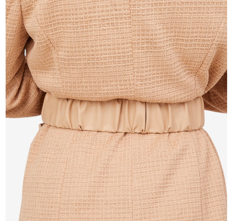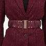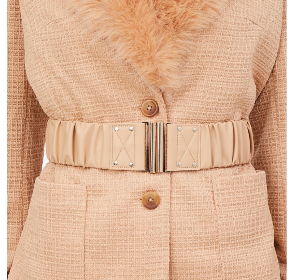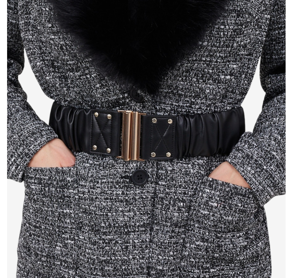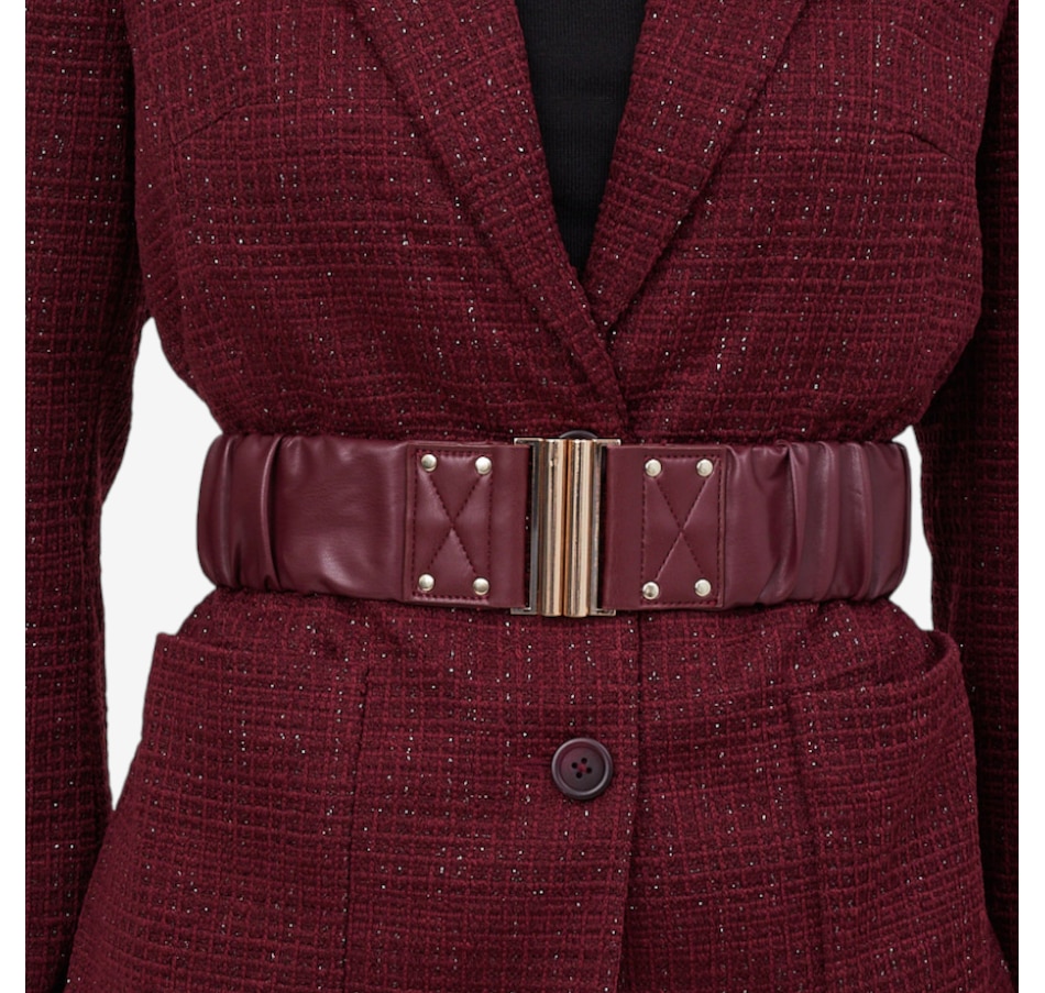 This is an elastic encased faux leather belt with studs and a novelty closure. The faux leather has spandex and has a ruched effect on the other side. This is an easy belt to wear as it will stretch to your waist. The front closure is a metal clasp which is easy to close and can be stretched to an approximate extendibility of five inches. It's a great accessory to a blazer or an oversized shirt.